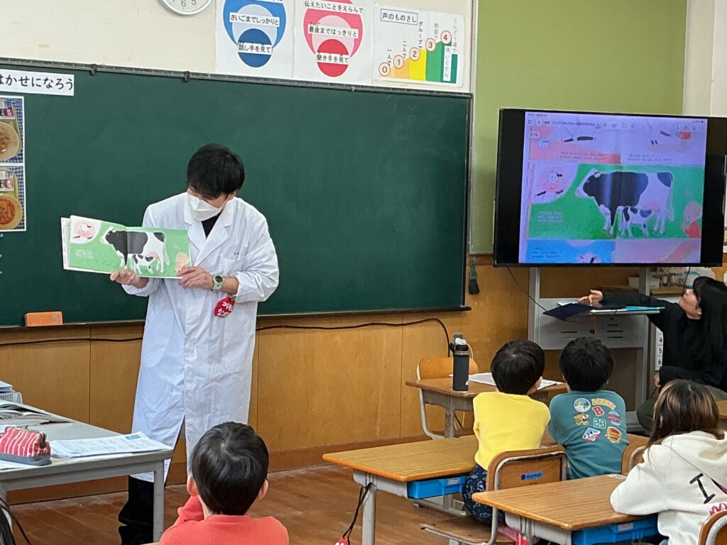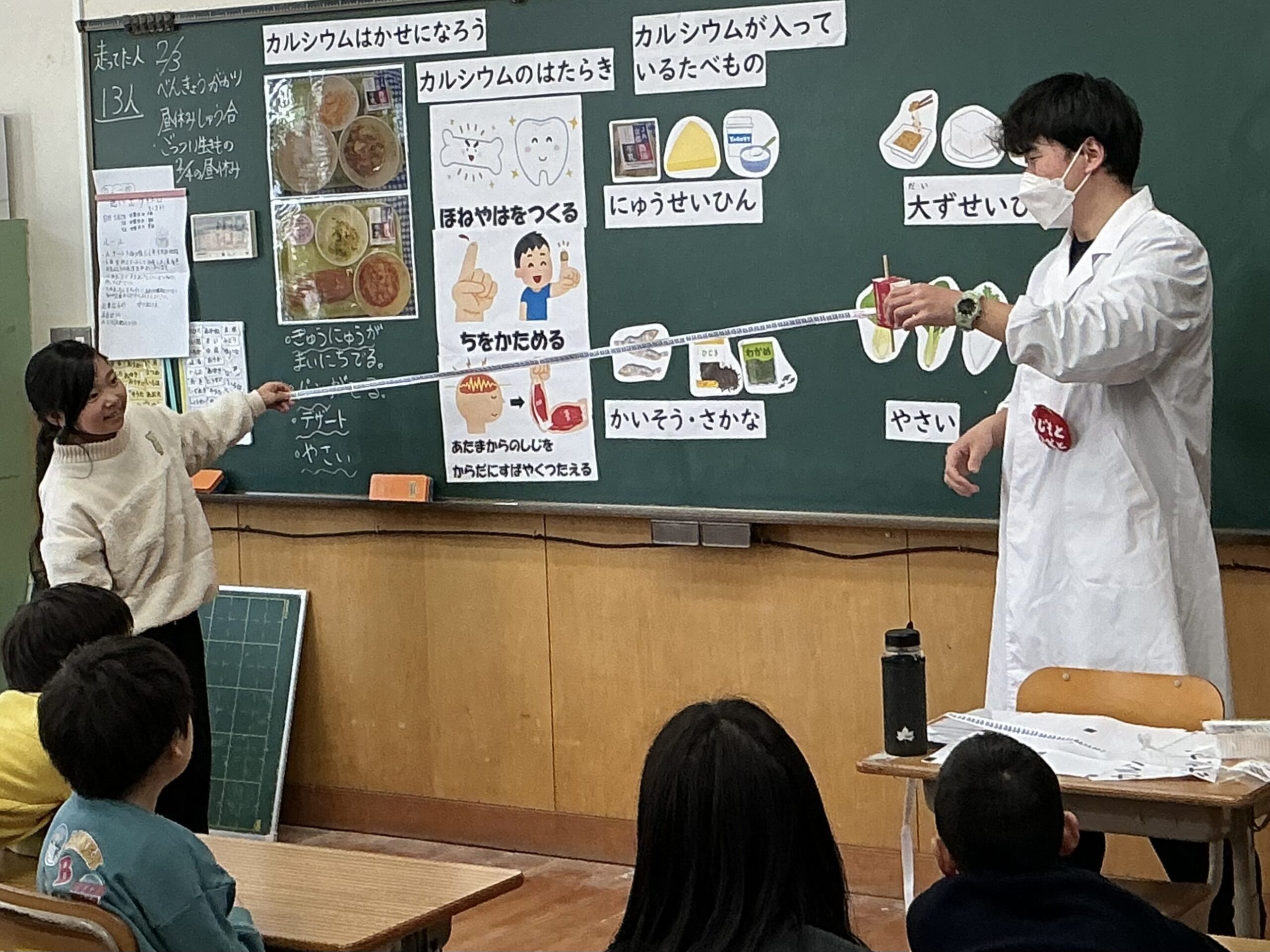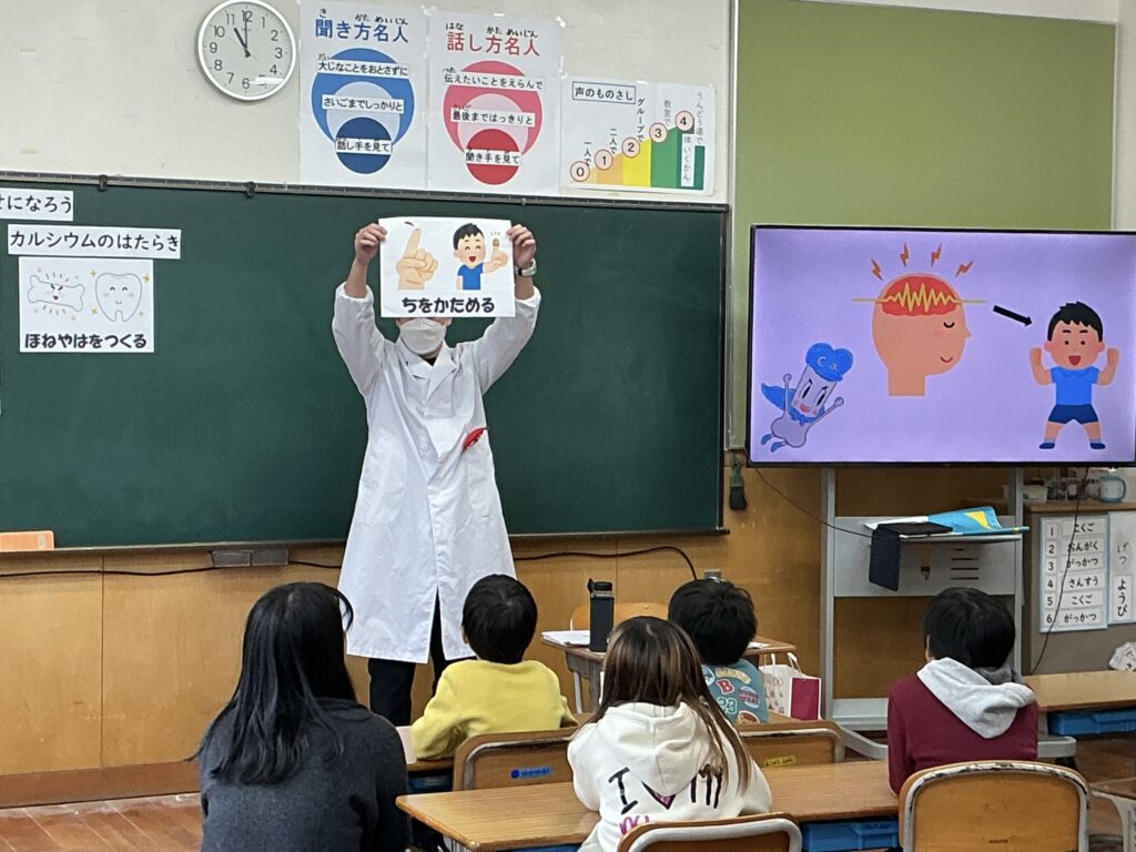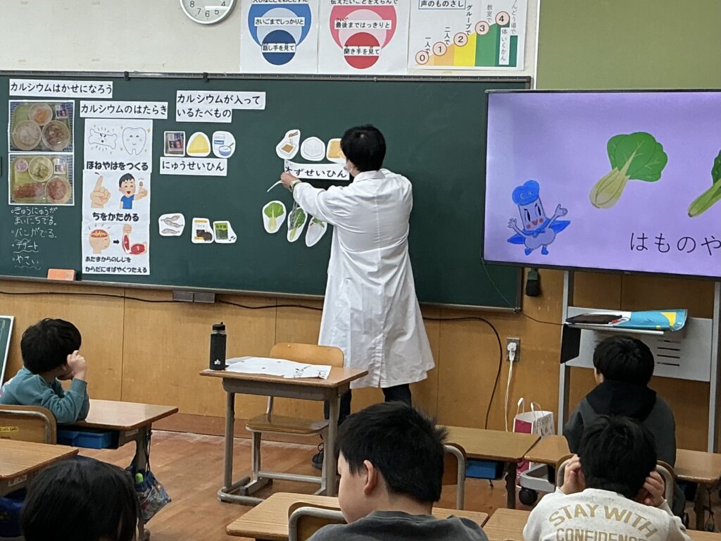 2月3日に栄養教諭の辻本先生に来ていただき、カルシウムのはたらきについて勉強しました。カルシウムには、骨や歯をつくる以外にも、血を固めたり、頭からの指示を体に素早く伝えたりするはたらきがあります。カルシウムのようせい「カルちゃん」と共に、一日にどれくらいの量が必要なのかや、どんな食べ物に含まれているのかを学びました。子ども達は、「牛乳って227カルちゃんも入ってるの!?めっちゃ入ってるやん。」 「給食いっぱい食べよ。」などと話ししながら、楽しく学習いていました。