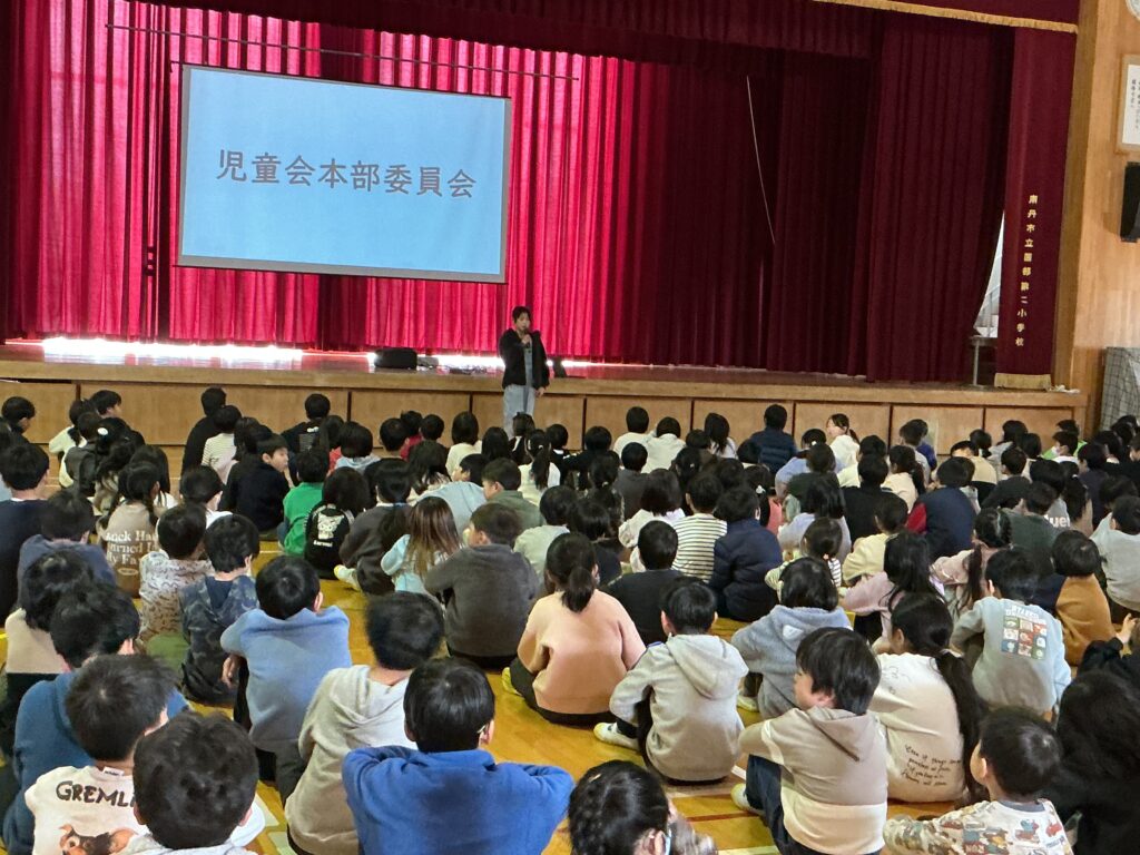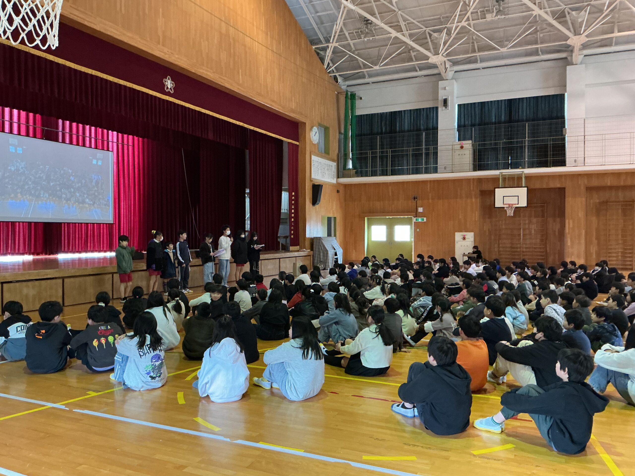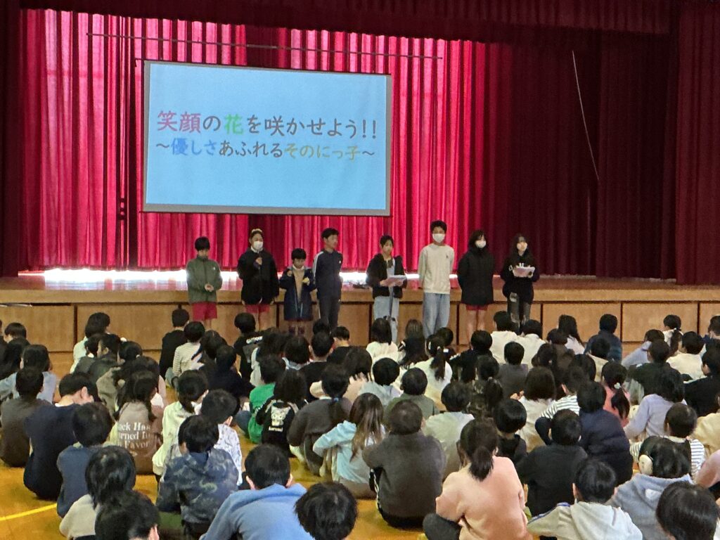 6日、本年度最後となる児童集会を行いました。本年度の児童会目標「笑顔の花を咲かせよう!!~優しさあふれるその二っ子~」を振り返り、児童会本部が発表しました。