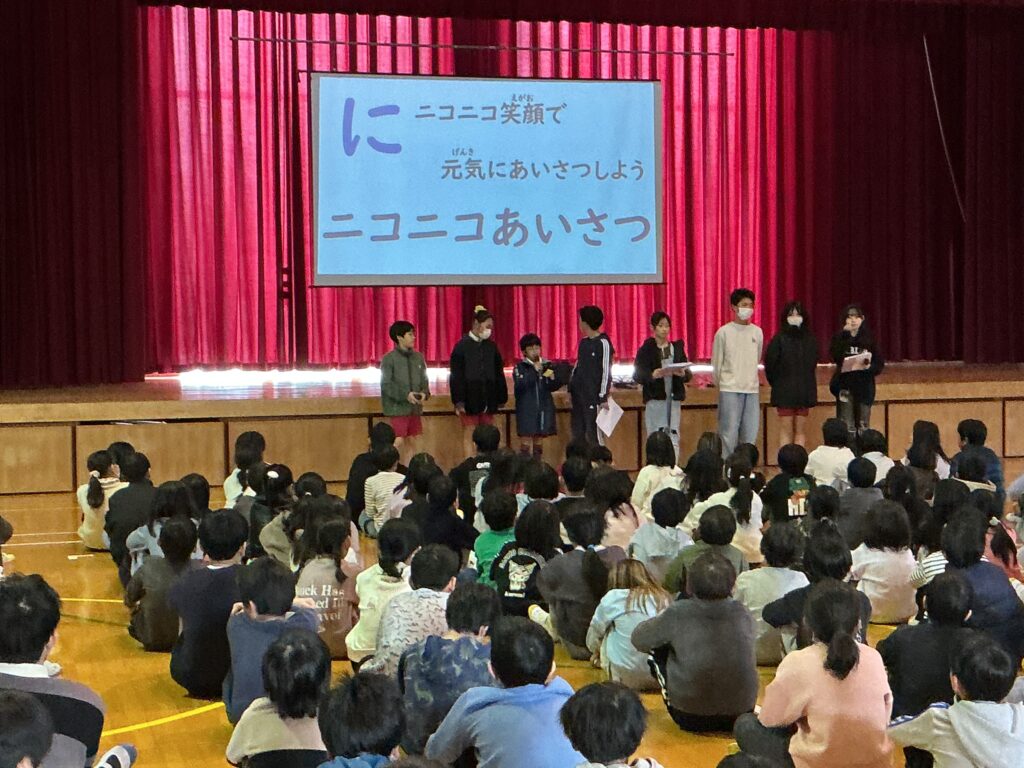 「そうじは静かにモクモクとがんばろう~モクモクそうじ~」「のんびりせずにキビキビベル着しよう~キビキビベル着~」「にこにこ笑顔で元気にあいさつしよう~にこにこあいさつ~」「つねに身の回りはピカピカに整頓しよう~ピカピカ整とん~」「こうしゃの中はテクテクと静かに歩こう~テクテク歩行~」その二っこの約束を再度確認した後、各学年の笑顔の写真と、各学年の良さを紹介してくれました。