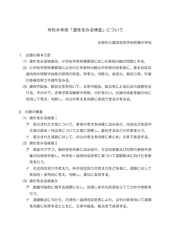 令和8年度入学者選抜「適性をみる検査」について 入学者選抜 2025.09.132025.06.17 附属中学校の令和8年度入学者選抜「適性をみる検査」についての文書を掲載いたしました。 文書はこちら。 Post Views: 164