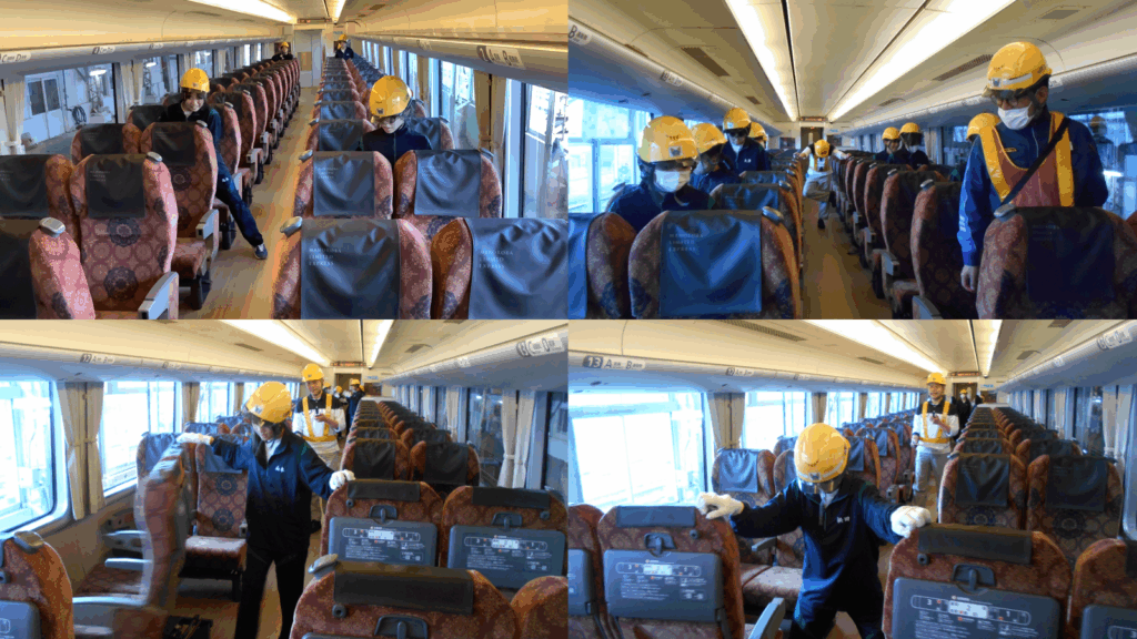 車内清掃の体験では、座席の回転やテーブル拭きを競争しながら楽しく体験しました。