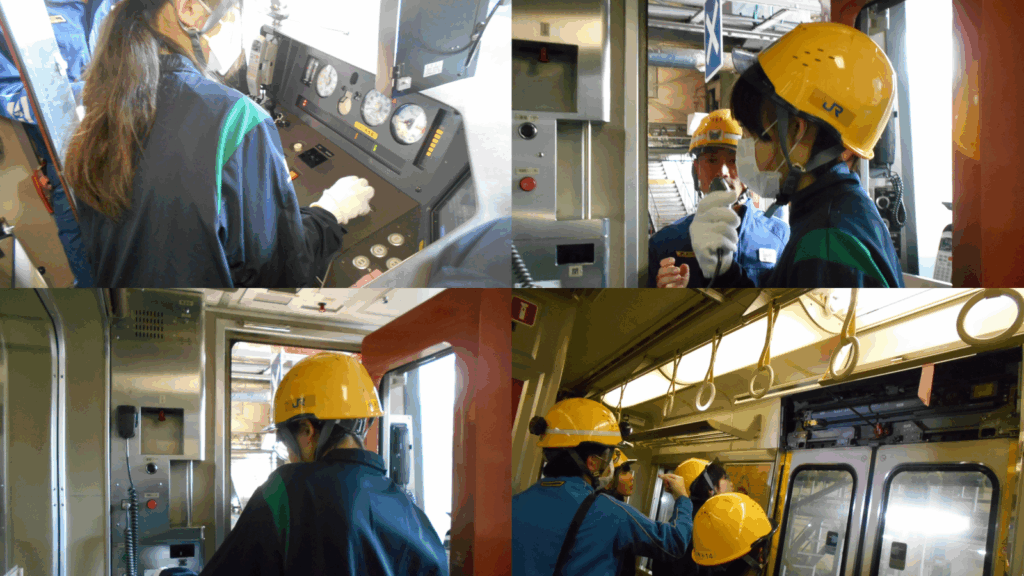 検修作業の体験では、検修中の車両のブレーキハンドルやドアの開閉ボタンを操作させていただきました。また、車両の構造についても説明していただきました。