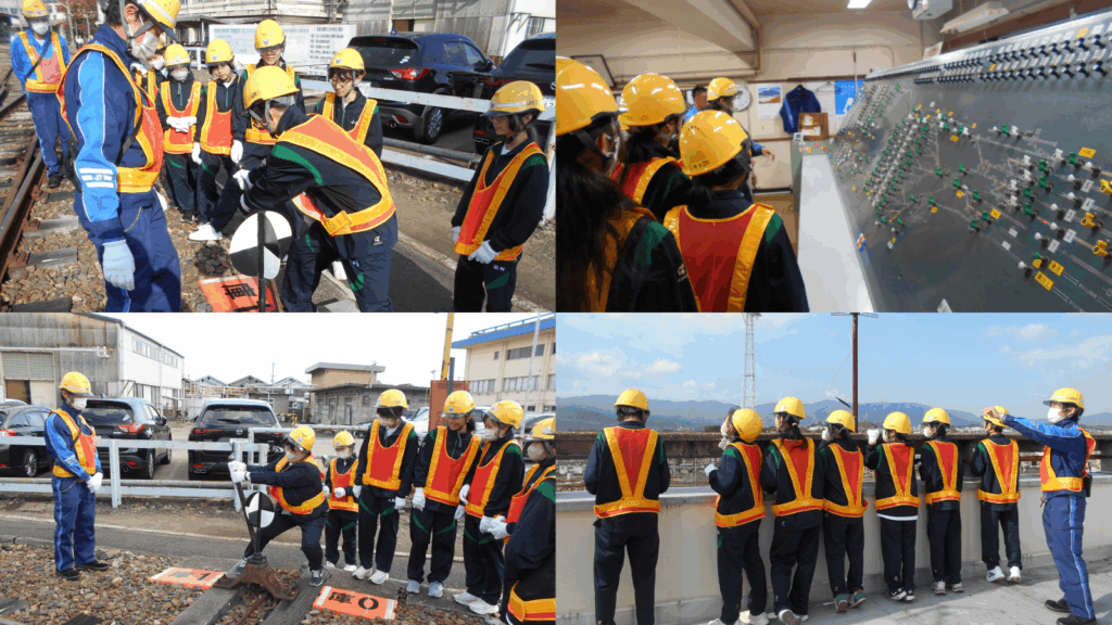 輸送の仕事の体験では、構内の様子や車両をどのように管理されているかを説明していただきました。また、列車の進路を変更する分岐器の操作をさせていただきました。