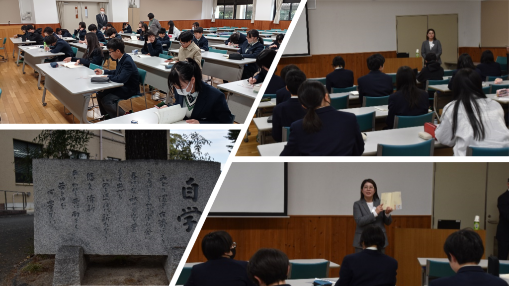 手帳講演会 2026年度のNews 2026.04.142026.04.10 4月9日(木)、株式会社NOLTYプランナーズから講師を招いて手帳講演会を開催しました。本校では1人1冊手帳を持ち、学校や各自の予定や宿題などを書き込み、自己管理ができる力を育成しています。日・週ごとの学習時間や将来の目標を書くなど様々な使い方ができます。城門をくぐると毎日目にする石碑にも刻まれていますが、将来の夢の実現に向けて、手帳を使いながら「自学力」を磨いていきましょう。 Post Views: 11