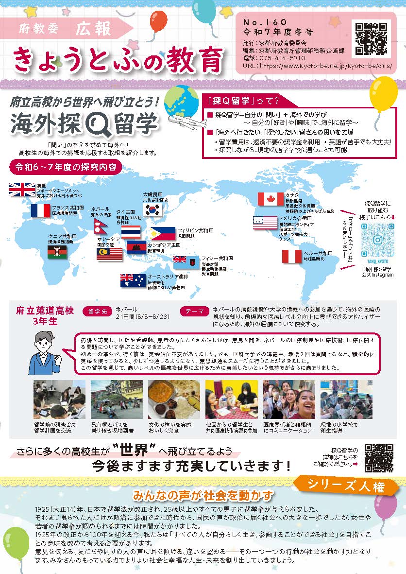 京都府教育委員会の事業や学校の教育活動などを紹介する広報誌、「きょうとふの教育」を定期的に発行しています。