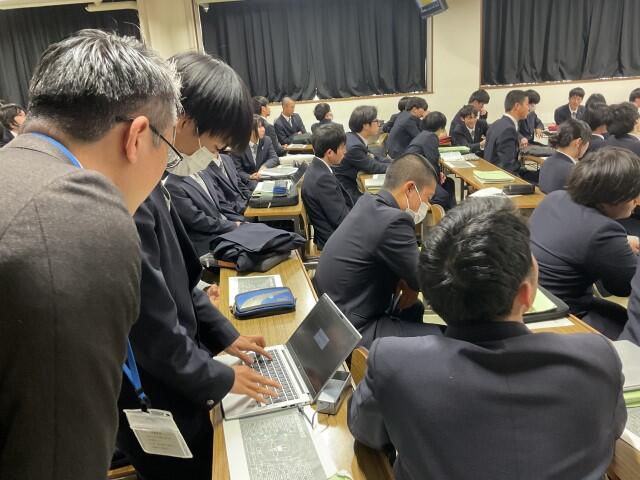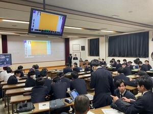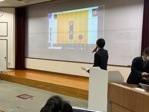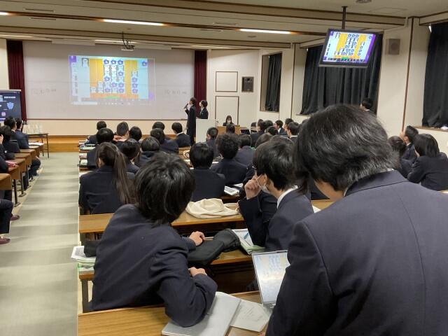 2月12日(木)に視聴覚室にてプログラミング競技会を行いました。参加校として、鳥取県立鳥取湖陵高等学校が来校し、「重力四目並べ」において、全22チームがそれぞれ作成したプログラムにより試合を行いました。また、今年度は来校された鳥取湖陵高校の生徒さんと生徒交流会も行いました。
