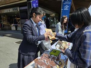 店の前を通るお客様はほとんどが観光客ということもあり、日本語・中国語・英語を使い分けながら、生徒たちは積極的に声をかけ、協力して販売に取り組みました。