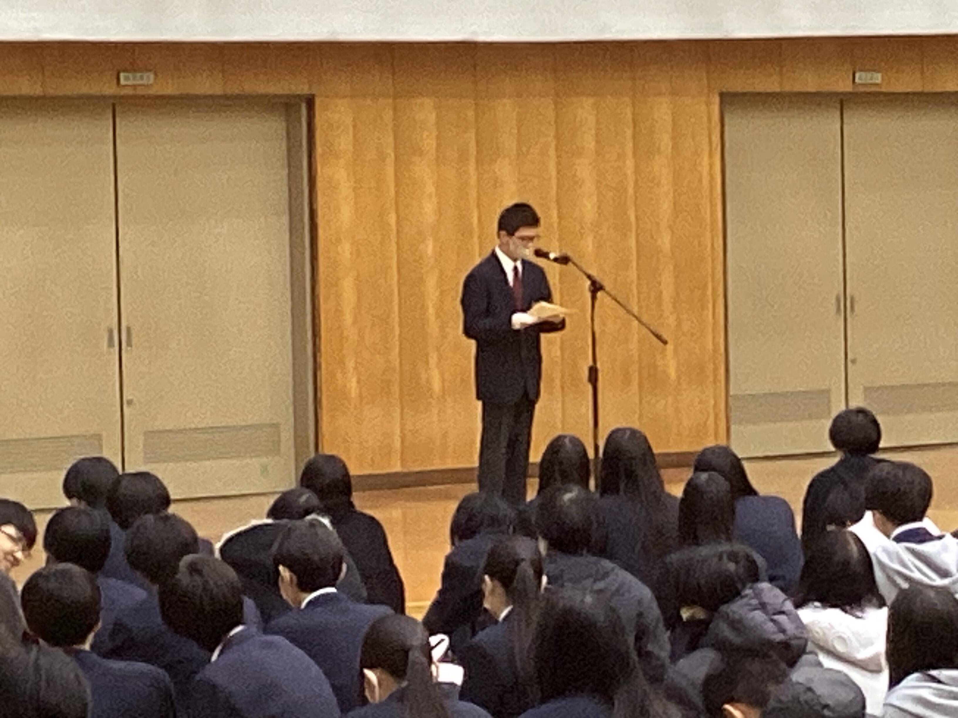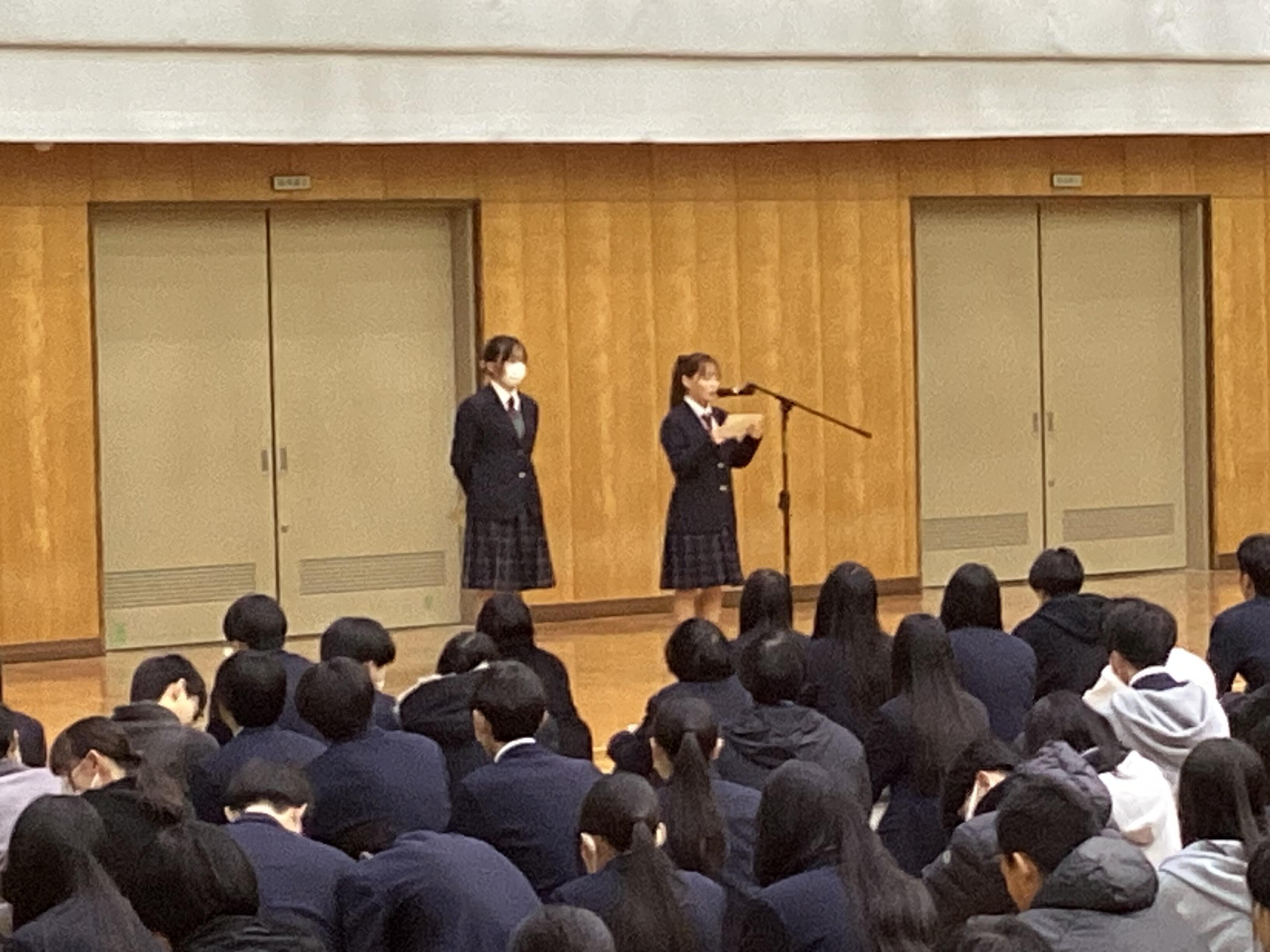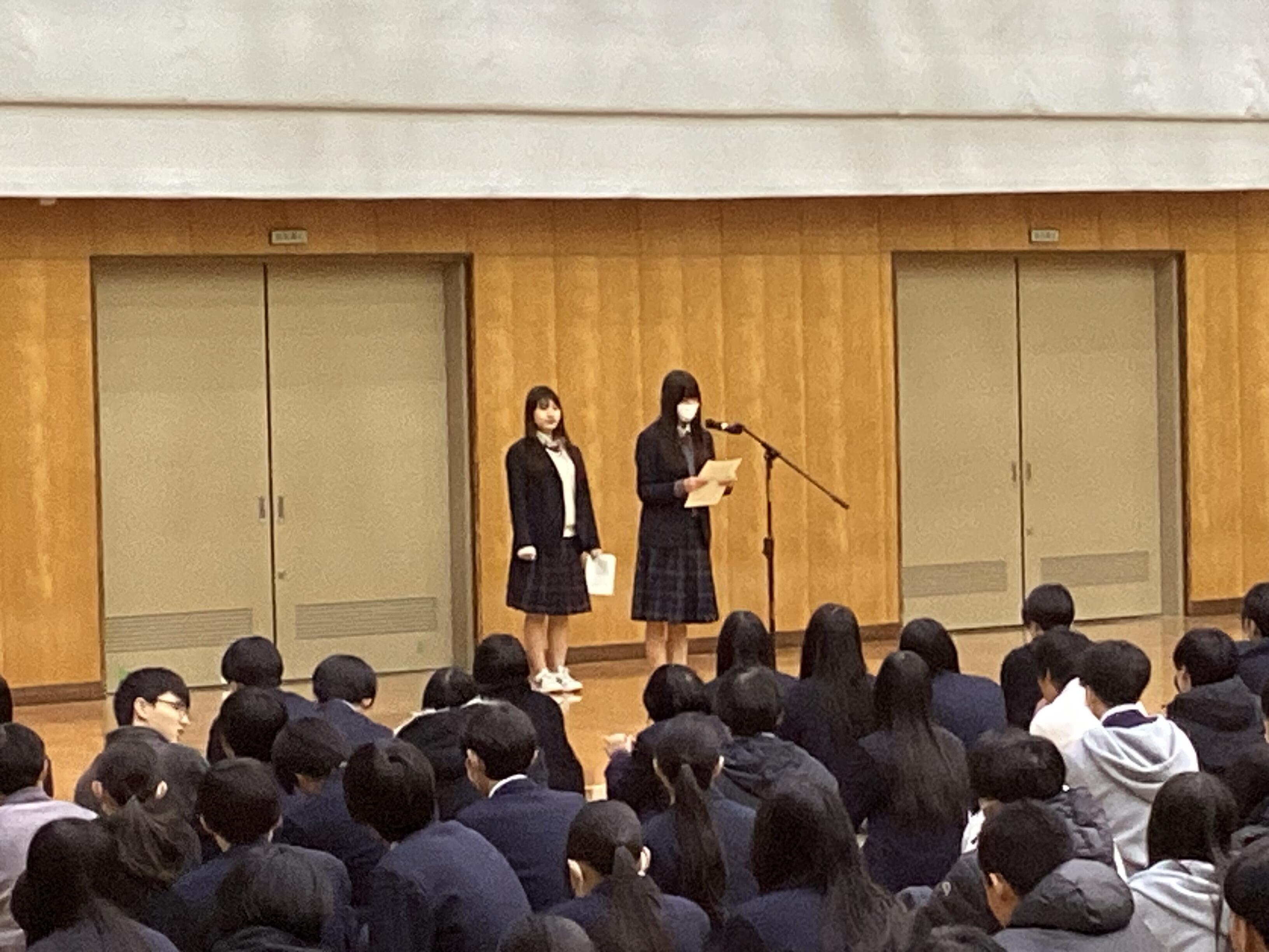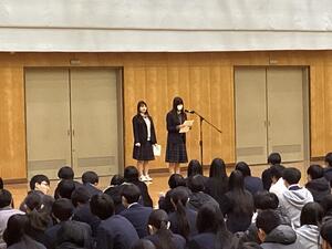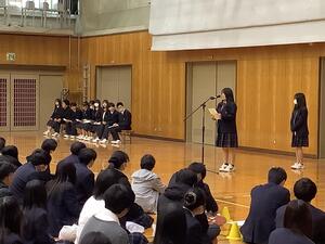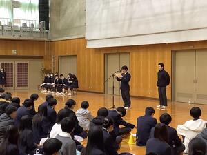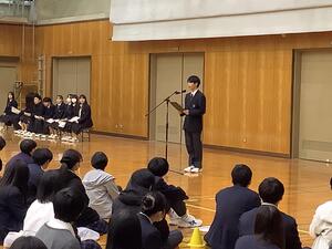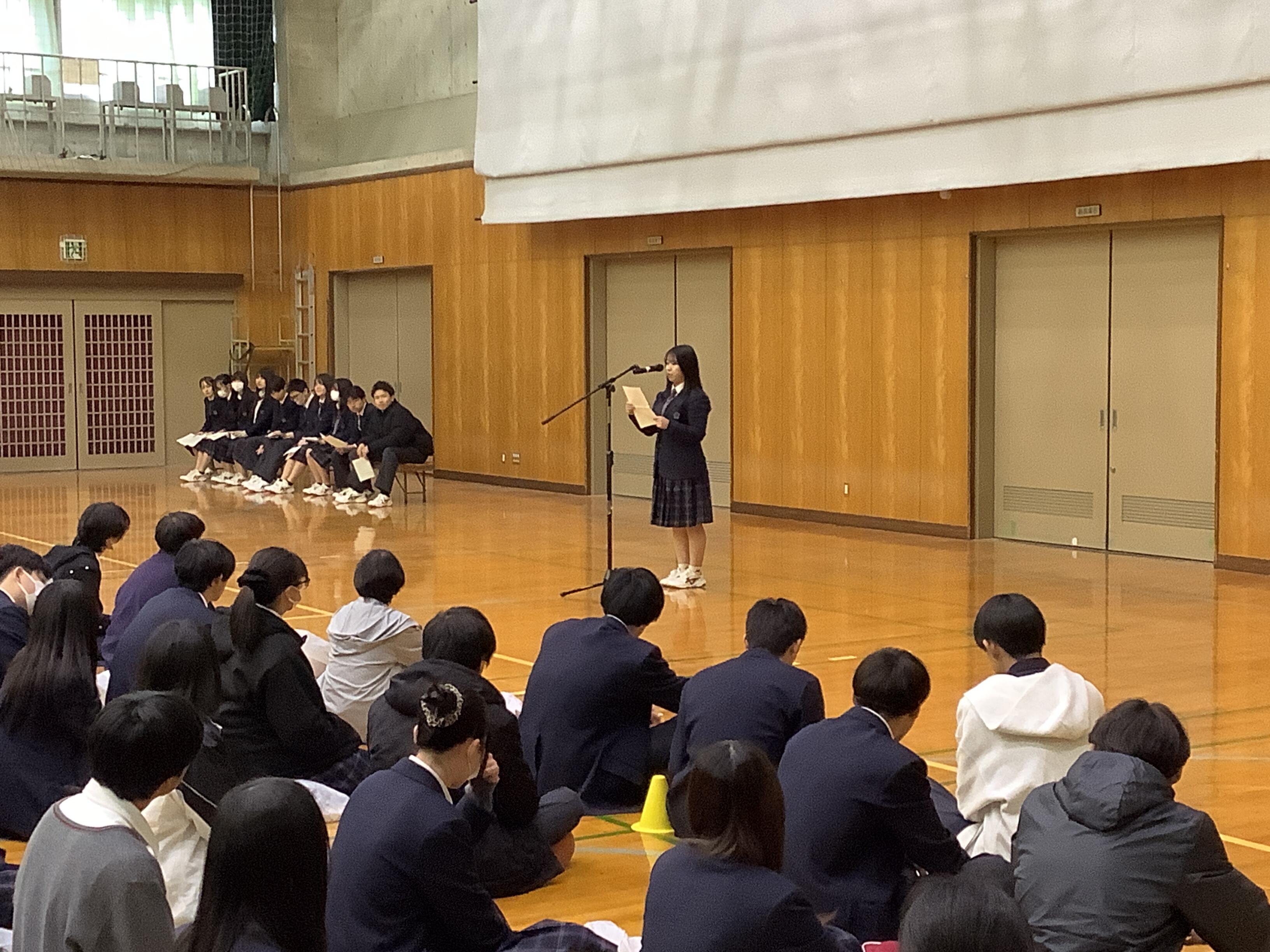 体育館で立候補者と応援者が全校生徒に向けて演説を行いました。
