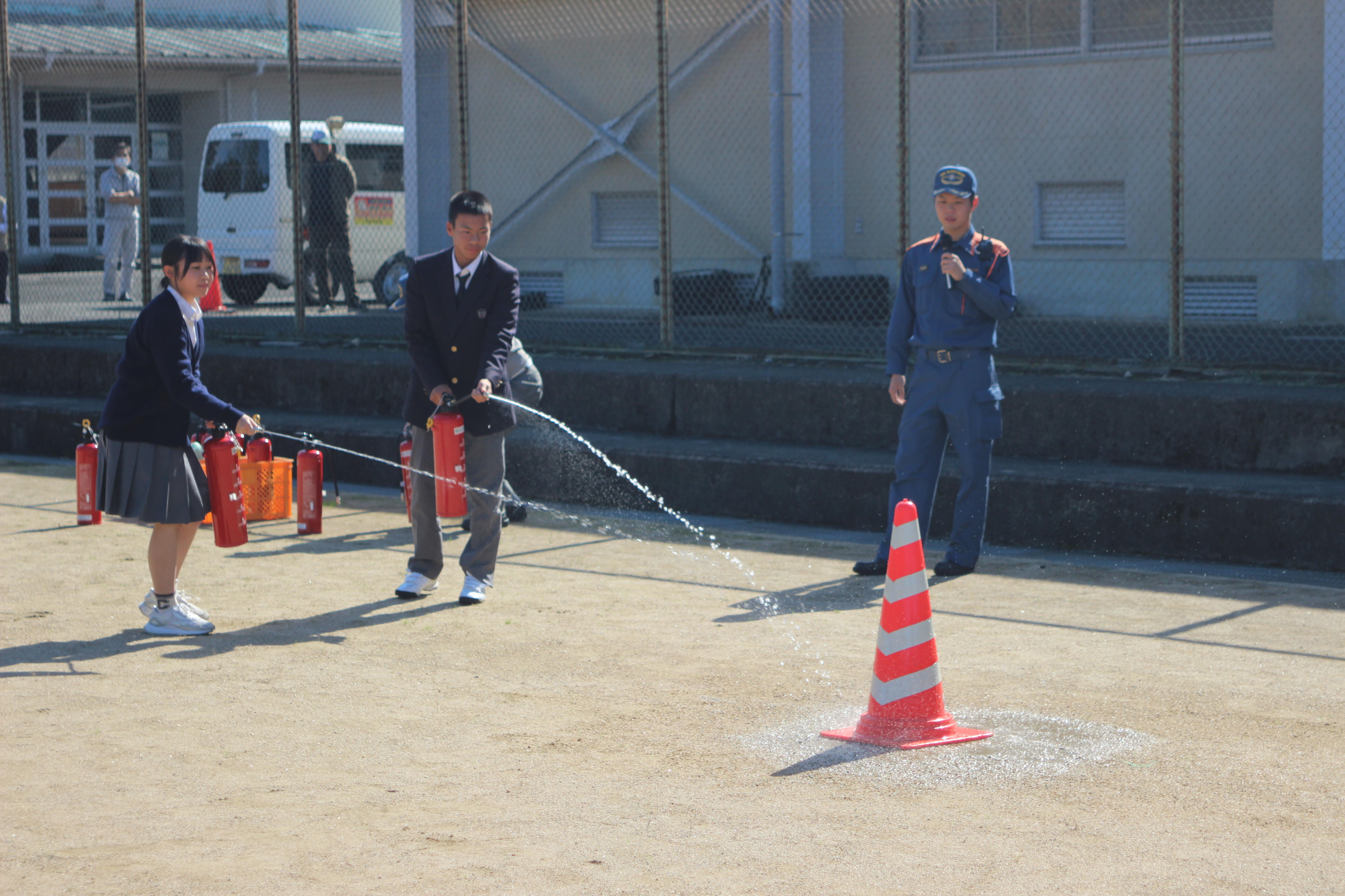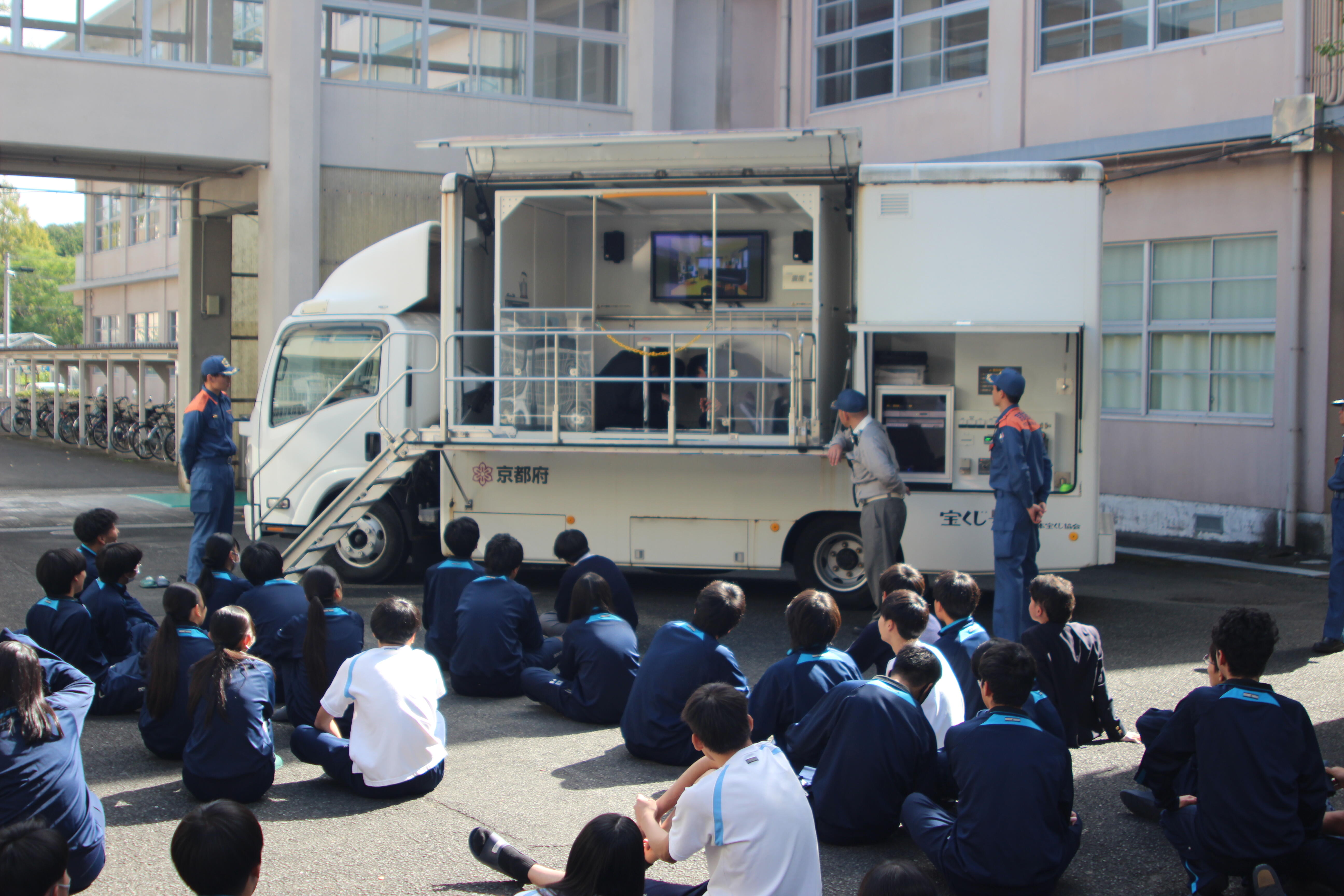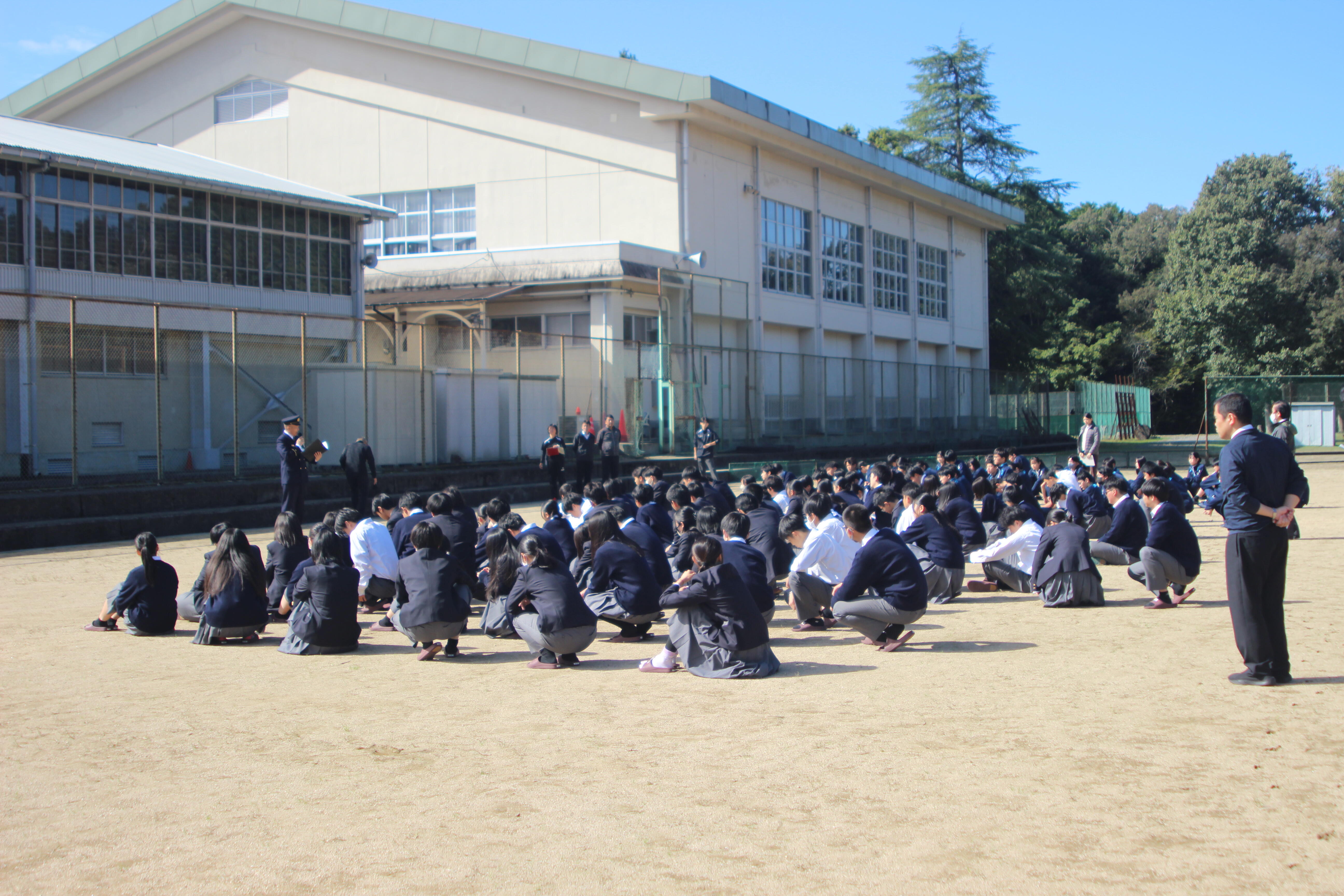 10月24日(金)、中間考査最終日の考査終了後に防災訓練を実施しました。地震を想定した避難訓練を行った後、園部消防署の協力・指導で1年生は消火器を用いた消火訓練、2年生は煙体験、3年生は起震車による地震体験を行いました。地震体験では、近い将来に起こる可能性がある南海トラフ地震で想定される震度を体験しましたが、想像以上の揺れに驚いた様子でした。万が一、地震や火事などの災害に見舞われた場合、まずは自分や周囲の人の身の安全を確保すること、次に火の元の確認することが大切であると教えていただきました。