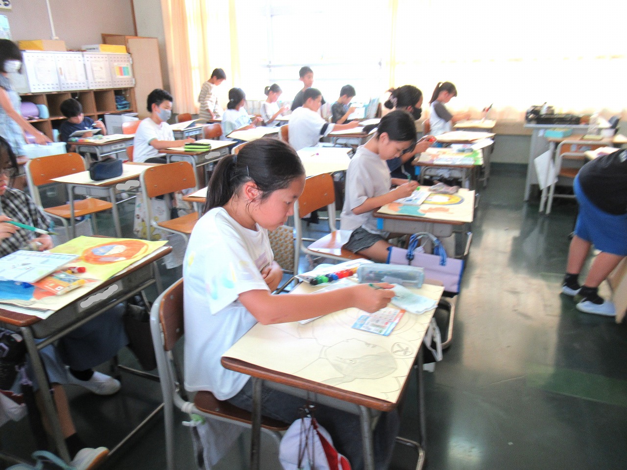 ずいぶん涼しくなってきました。どの学年でも、運動会練習をしながら学習もがんばっています。読書感想文や絵画の制作にも一生懸命取り組んでいる様子が見られます。よい作品にしようと丁寧に描いたり、思い思いに表現する楽しさを味わったりしています。(写真は5年生と3年生です)