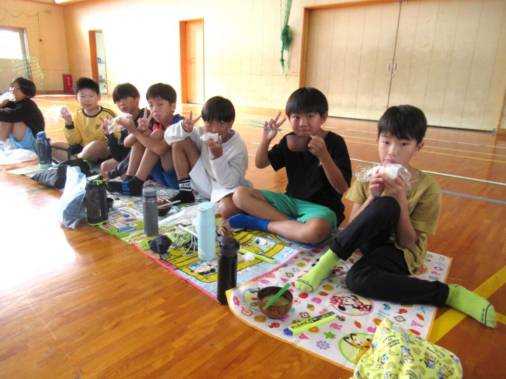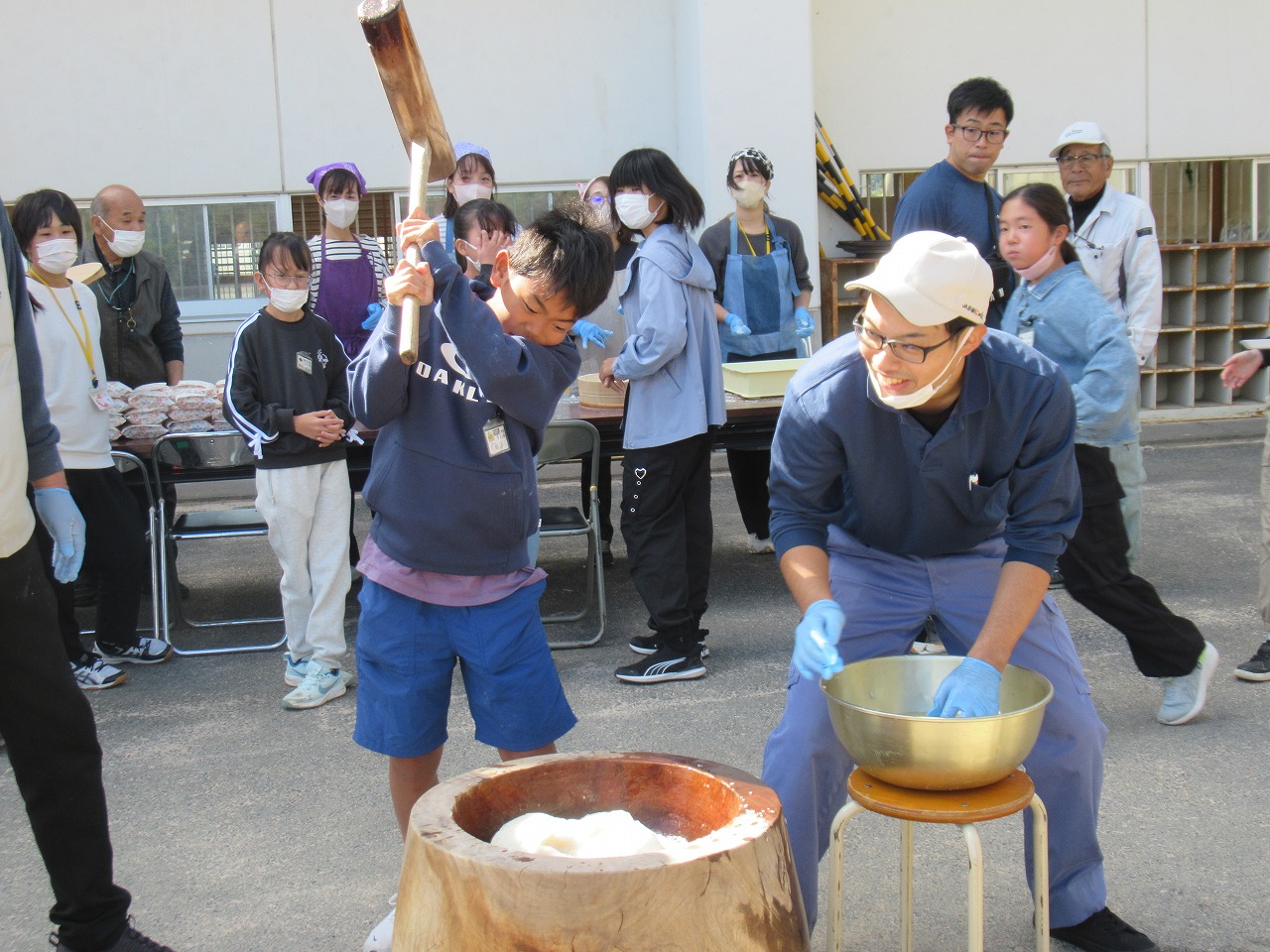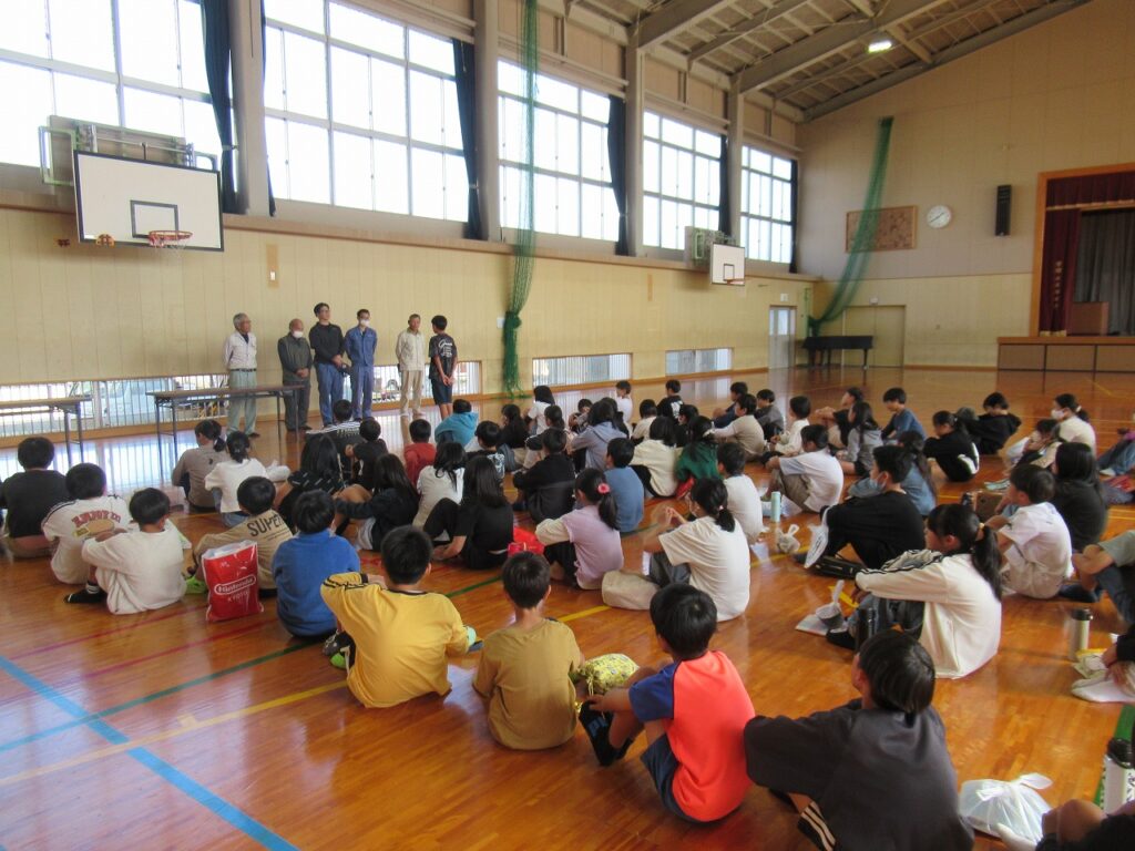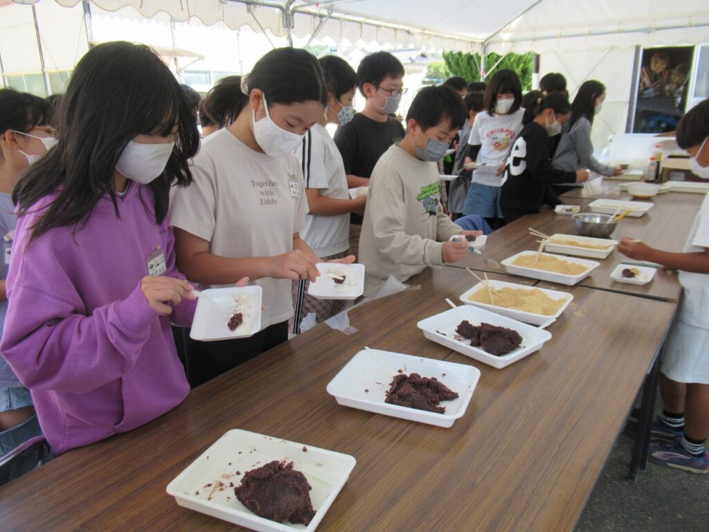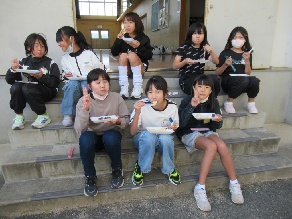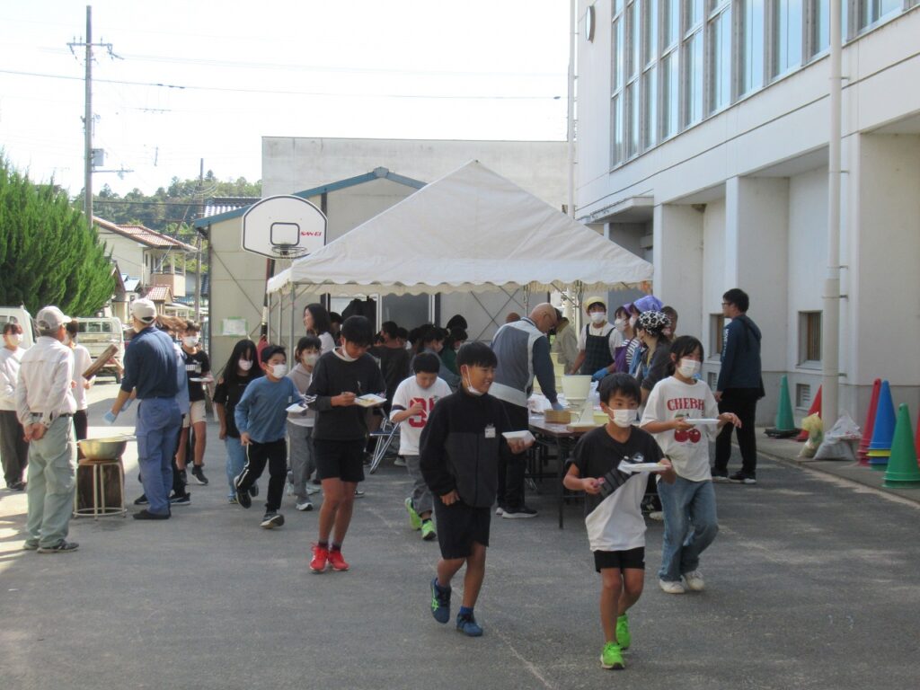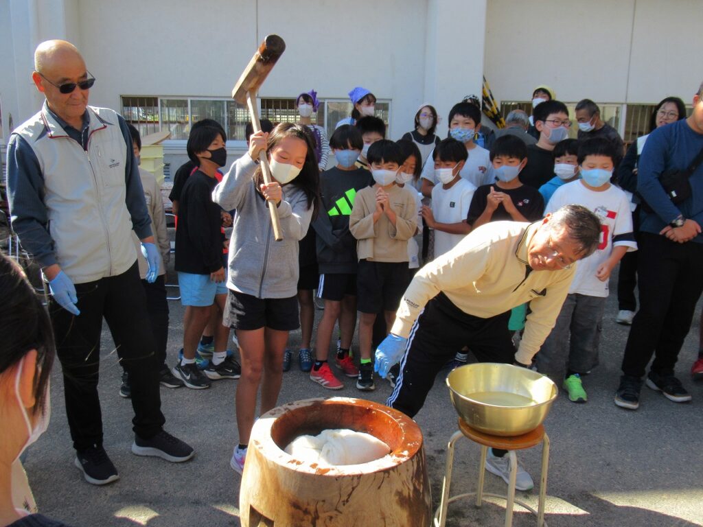 5年生が地域の方々と一緒に収穫感謝祭を行いました。今年1年、地域の営農組合の方々には、田植え、稲刈りの体験をさせていただきました。食への感謝、地域の人への感謝の気持ちをもって、友達と協力し、地域と方とも交流を深め、収穫の喜びを味わいました。もちつき体験、おにぎり作りをし、豚汁をみんなで食べました。地域の方から「しっかり食べてしっかり勉強してください」との言葉をいただき、顔を見合わせてにっこりしていた子どもたちです。