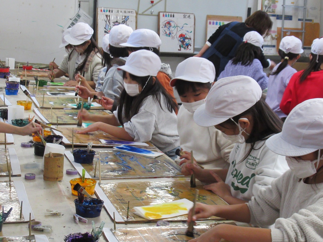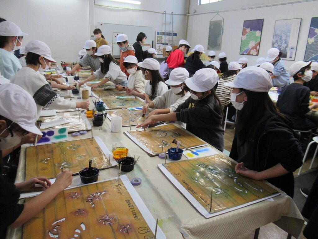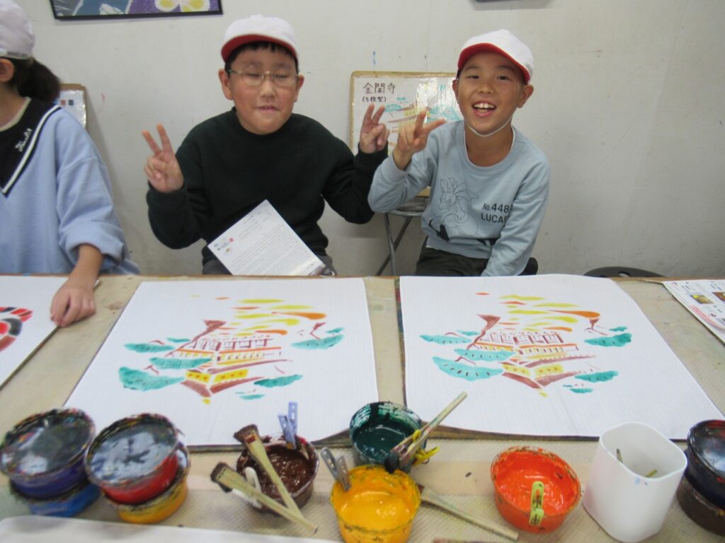 子どもたちが一番わくわくしたのは友禅染体験です。染料をハケになじませ布に刷り込んでいく方法で京都らしい素敵な絵柄のハンカチを仕上げていきました。「初めての人でも上手にできるってほんまや!」「社会見学、最高!楽しい!」と大満足の様子でした。