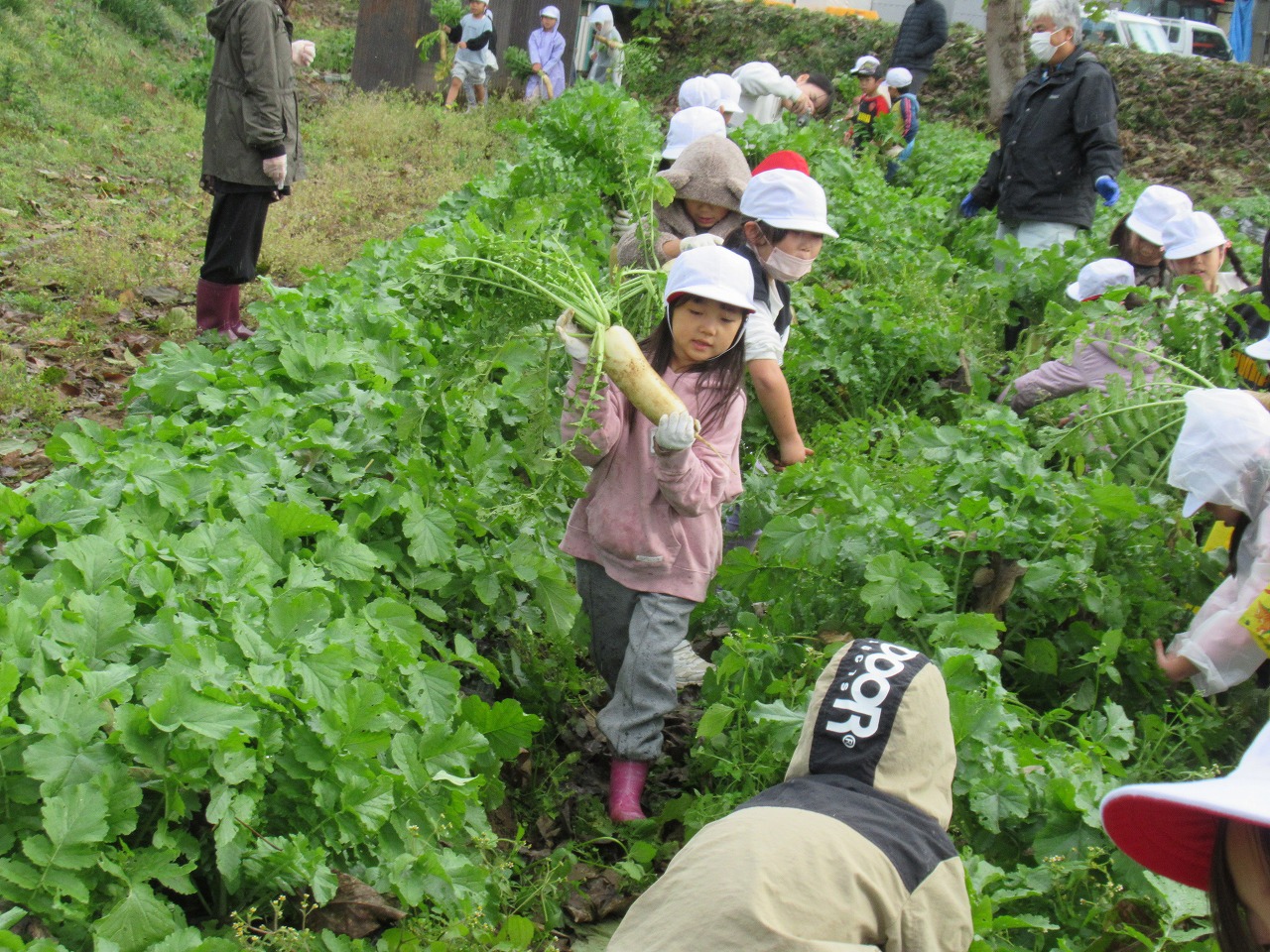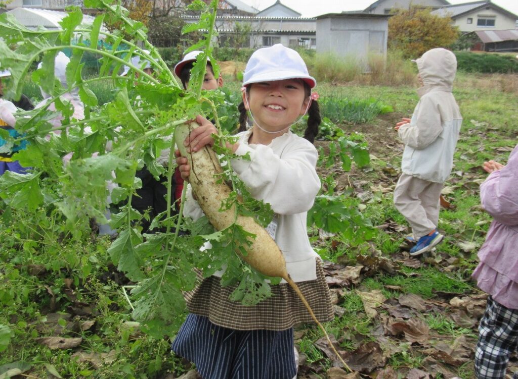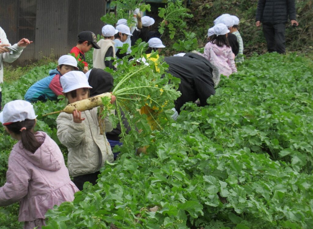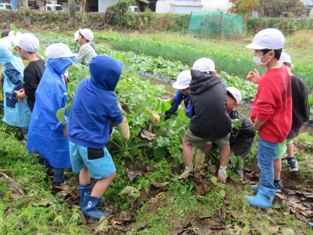 1年生が地域の営農組合の畑で大根引き体験をさせていただきました。大根を上手に引くこつは、まっすぐ上に引くことだと教えていただき、その通りにひきました。太くて長い大根が次々に収穫できました。
