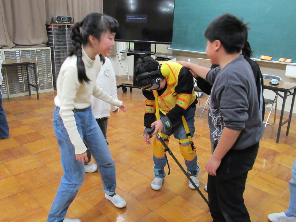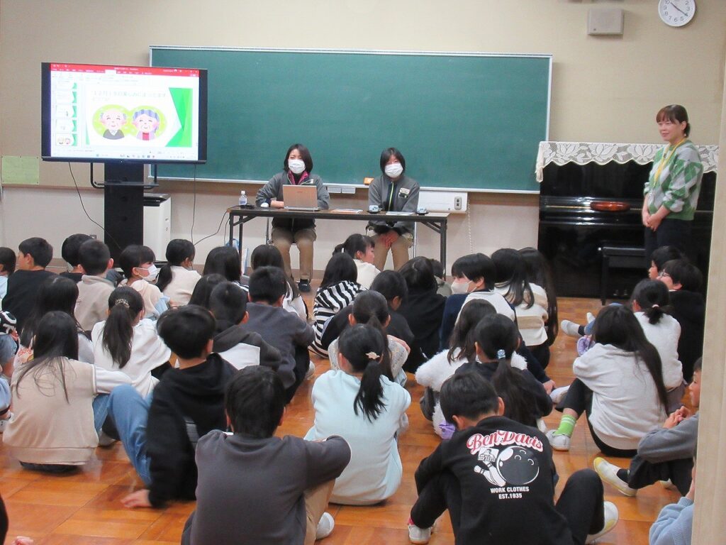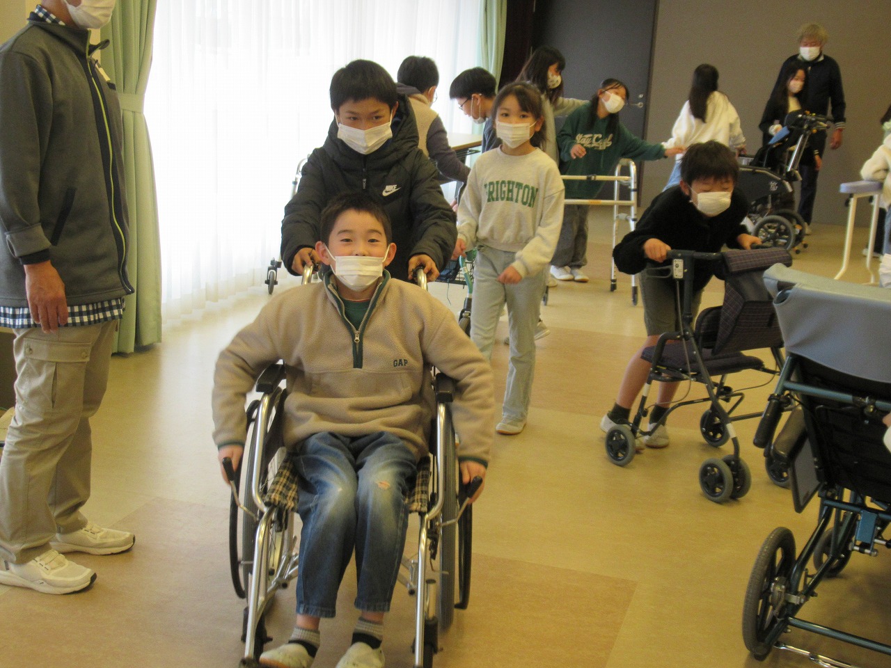 4年生が高齢者福祉施設「豊の郷」を訪問しました。事前に高齢者の人の体の様子や接し方を教えていただき、高齢者の疑似体験もさせていただきました。訪問当日は、リコーダーや歌を聴いていただいたりふくわらいをしたりして交流しました。おじいさんおばあさんの笑顔を引き出していた子どもたちです。
