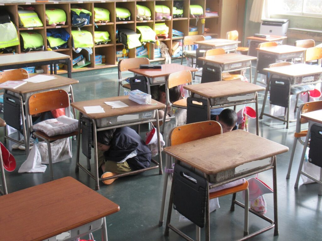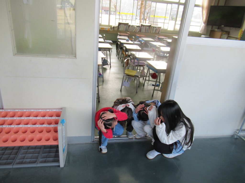 子どもたちは、地震発生の合図で、机の下に潜ったり、頭を守ったり、物が落ちてこない広いところでしゃがんで体を丸めたり・・・これまでの訓練を生かして命を守る行動をとることができました。近くにいる友達と協力して避難することもできました。