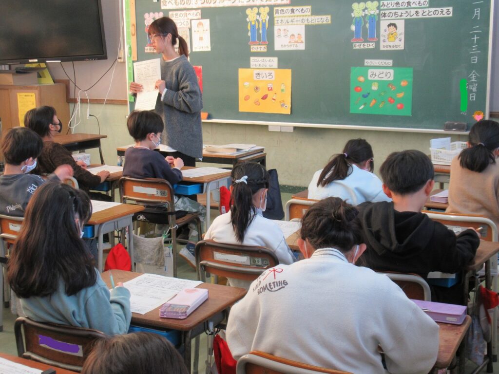 食べ物には、いろいろな栄養があり、3つのグループに分けられること、それぞれにはたらきがあることを知りました。その後、習ったことを生かして、今日の給食に使われている食品を3つのグループに分ける活動も行いました。給食をしっかり食べることが丈夫な体をつくることになると気づきました。食べることに関心を持ち、何でもよく食べて、健康な体をつくってほしいと思います。