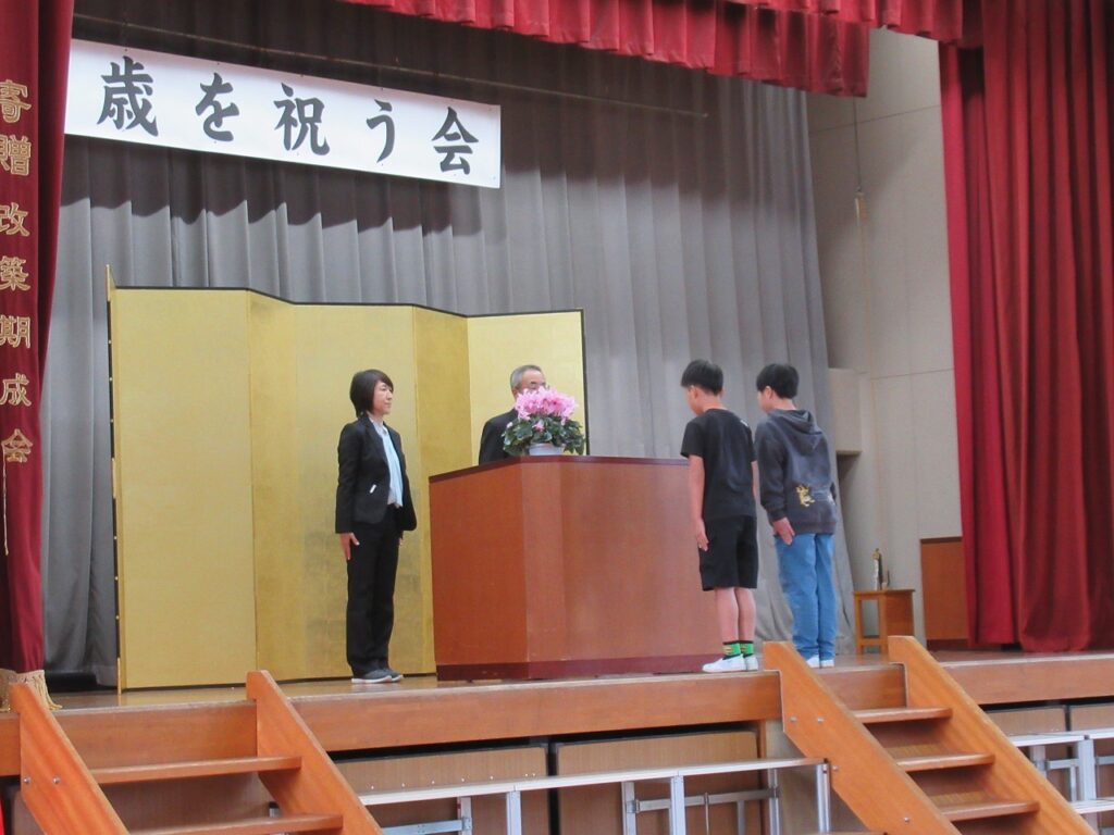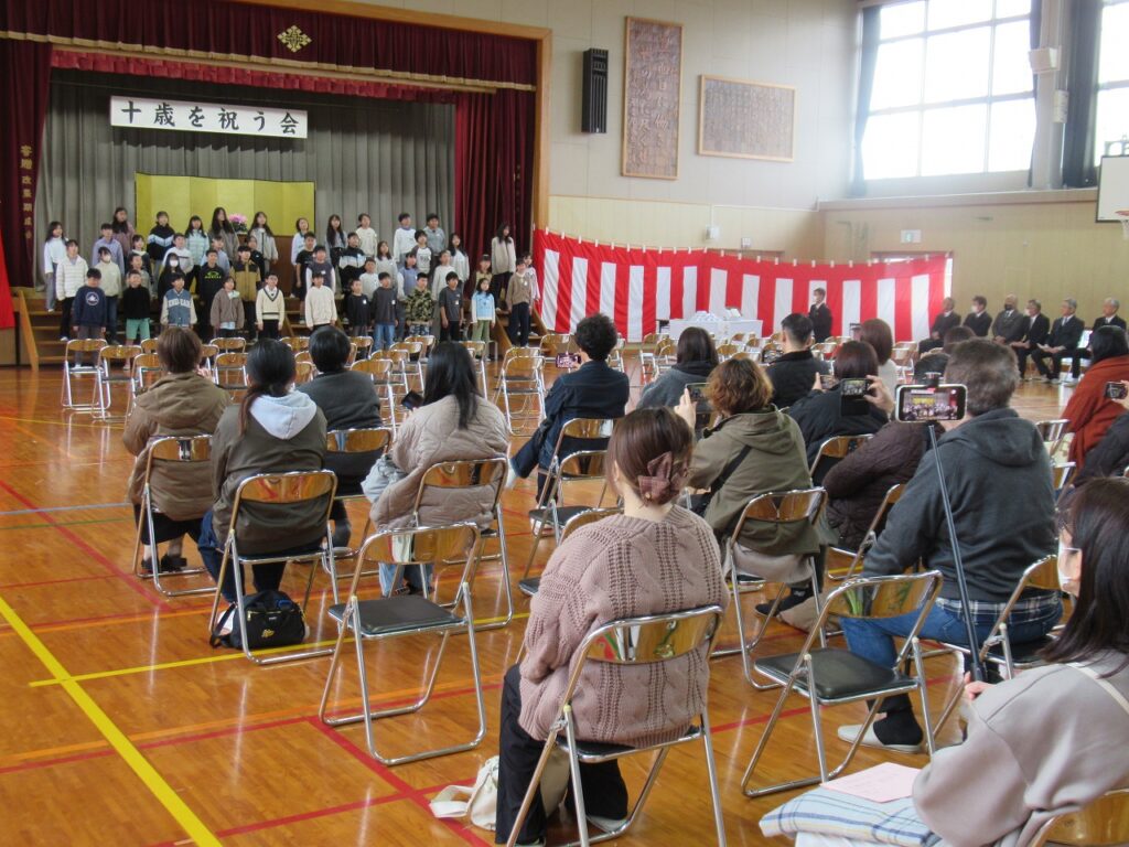2月6日(金)、「十歳(ととせ)を祝う会」がありました。公民館、自治会、地域との共催で、毎年この時期に行っています。今年も10歳になる4年生が参加し、地域の方々からお祝いしていただきました。