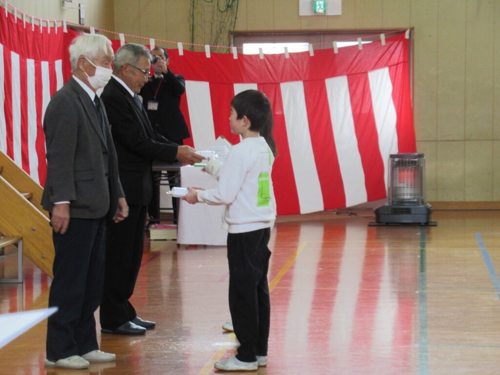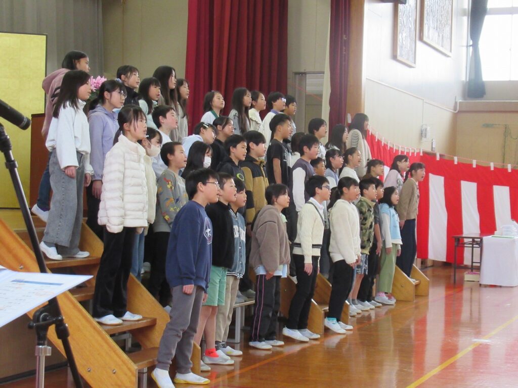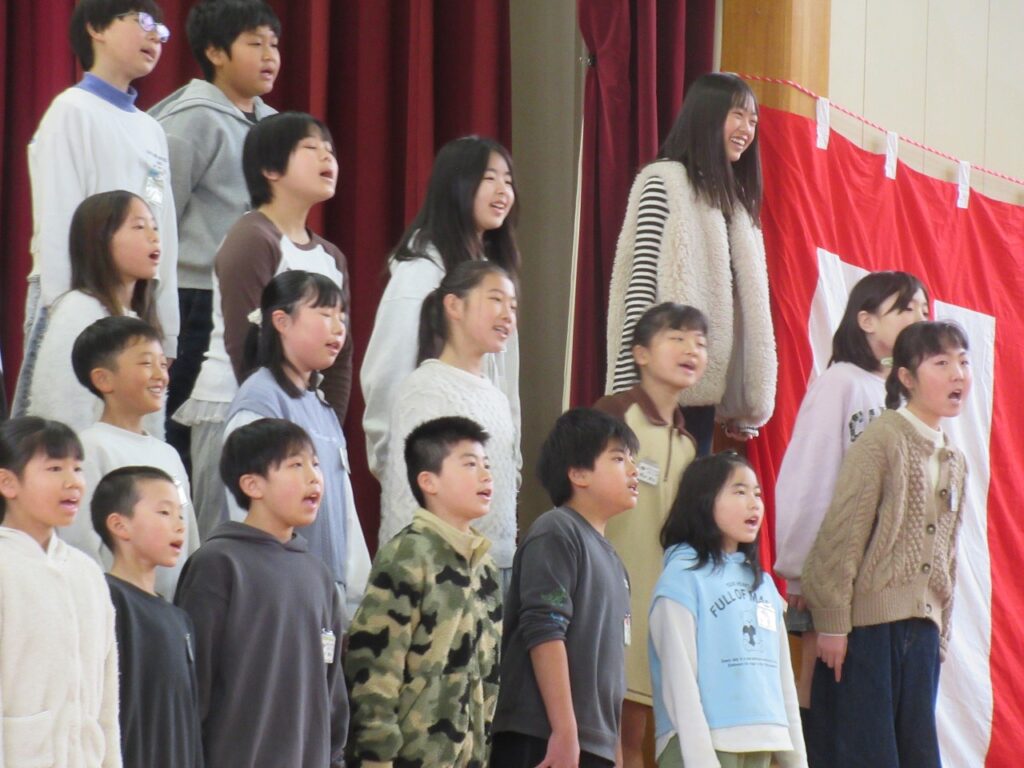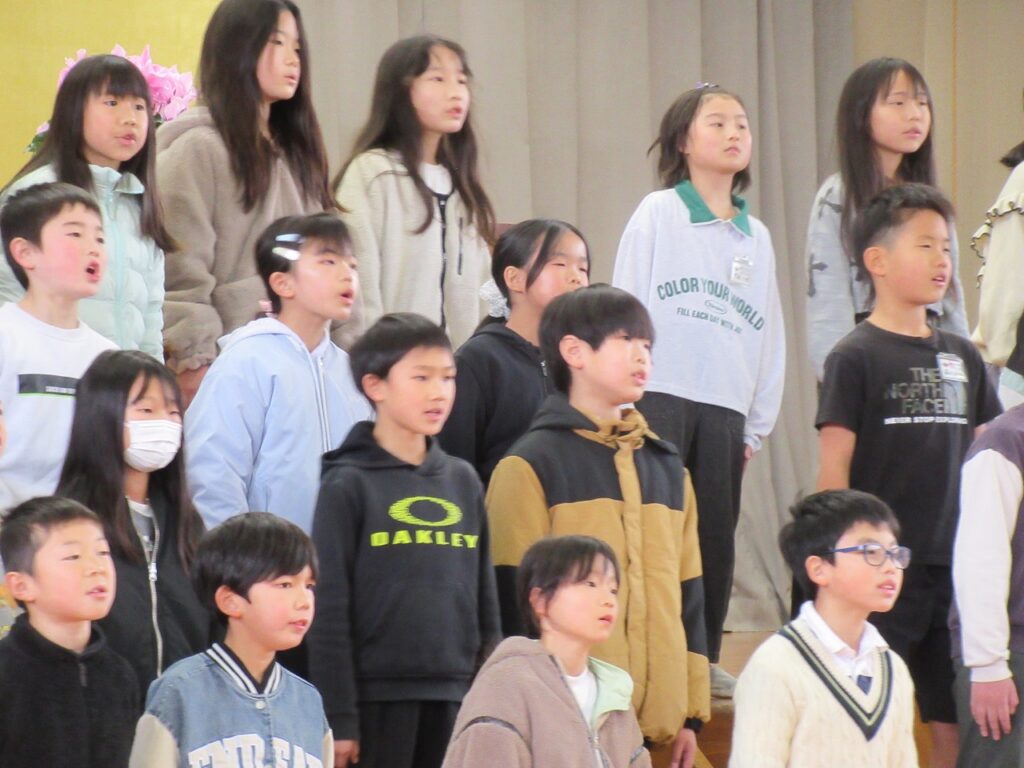 地域の皆さんから温かいメッセージやお祝いの品をいただいた後、4年生全員で感謝の言葉と歌を発表しました。これまで温かく見守っていただいた地域の方々、愛情深く育てていただいた家族の存在を改めて感じる機会となりました。「ありがとう、ありがとう・・・」の歌詞のところで涙する児童も・・・心の動く瞬間や感動がありました。