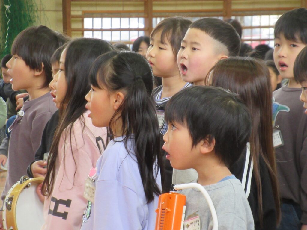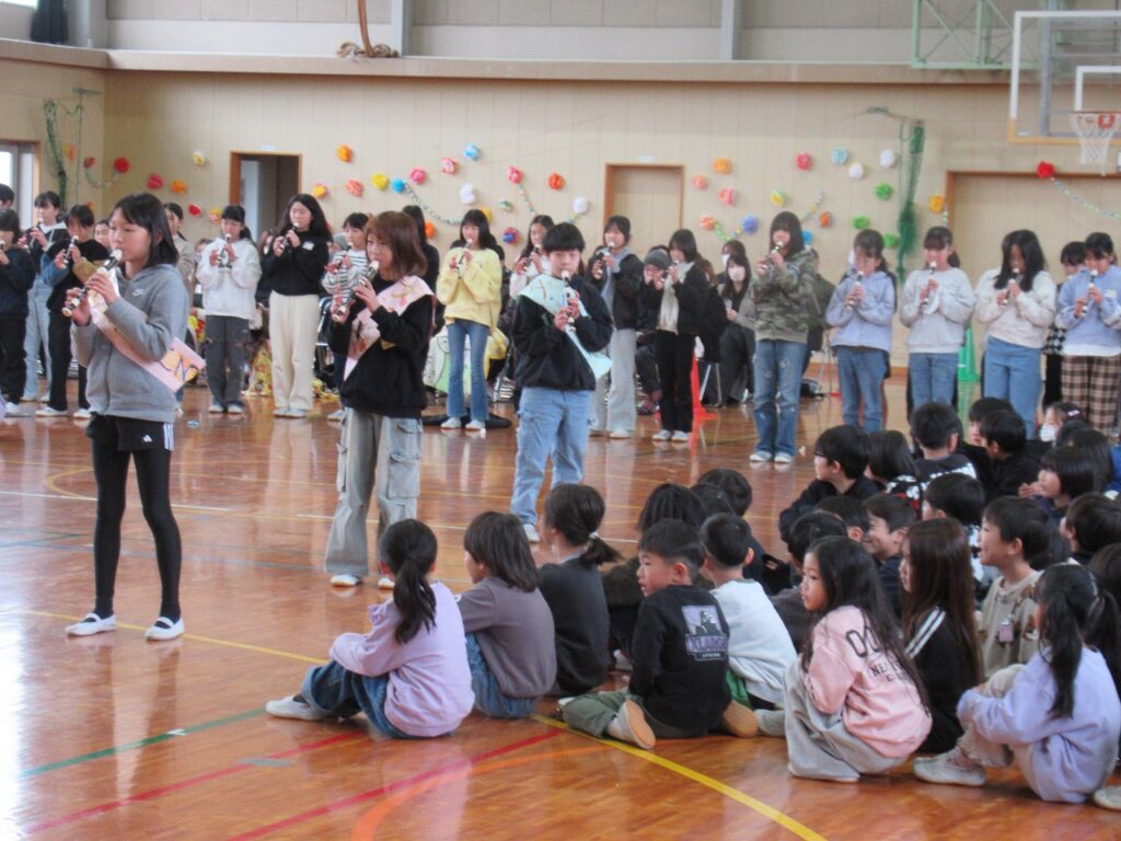 1~5年生から「やさしくかっこいい6年生」「わたしたちも6年生みたいになりたい!」とメッセージ、歌、合奏が送られました。6年生からは、6年間の思い出を振り返るとともに歌の発表がありました。会場がありがとうの言葉でいっぱいになり、あたたかい空気に包まれました。
