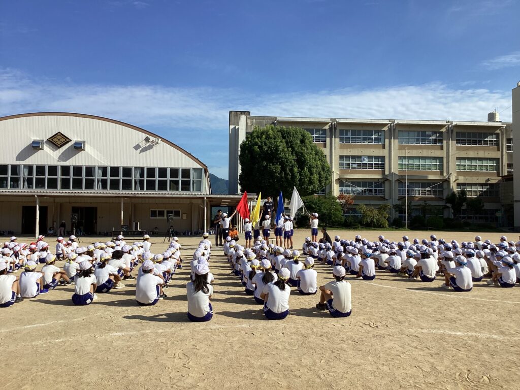 爽やかな晴天の下、全校での運動会練習を行いました。開会式の並び方、入退場のしかた、ラジオ体操の練習を行いました。大正の5つの自慢のひとつとして、3つの聞く態度「体を相手の方に向ける」、「目を見る」、「リアクションをする」(児童には、頭文字をとり「かめり」という略称で親しまれています。)を意識してきました。運動会練習の場面でも、自然とよい姿勢で話を聞くことができました。全体での練習後、各色ごとに分かれ、応援の練習に取り組みました。勢いのある声が校庭に響き、来週の運動会に向けての気合いが感じられました。