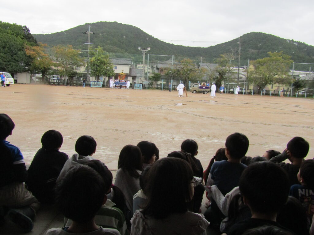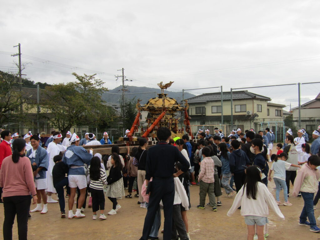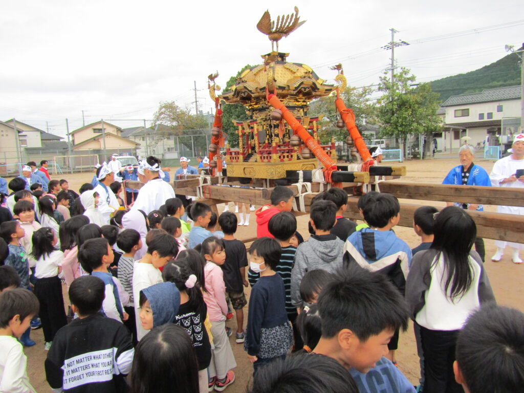 校区内にある歴史ある神社、大正校の校章の由来にもなったと伝わる「一宮神社」の神輿が、大正校のグランドにその勇猛な姿を見せました。普段は見ることのできない「おみこし」を目の当たりにし、興味津々の子どもたち。「おみこし」の近くに駆け寄り、触れたり観察したりする中で、一緒になって、「わっしょい!わっしょい!」と声をかけていました。
