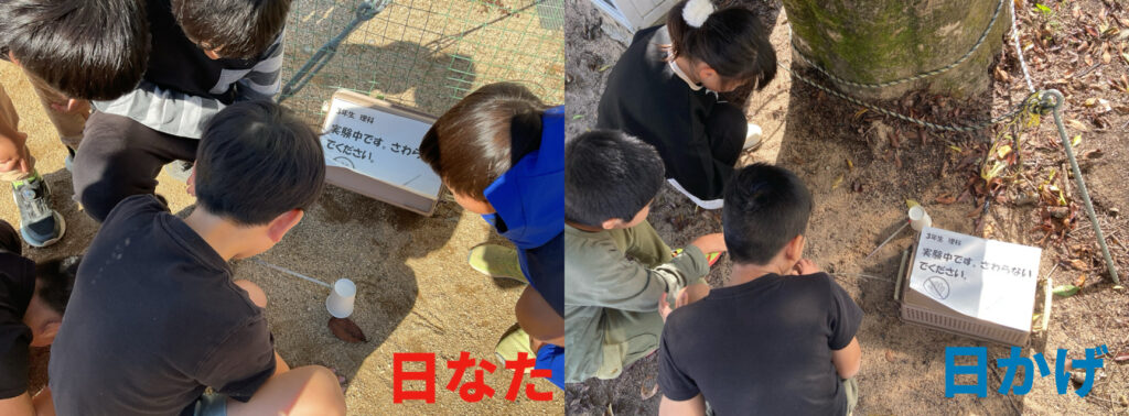 今日の天気は晴れ!3年生児童は、「日なたの地面」と「日かげの地面」の様子を観察しました。