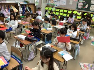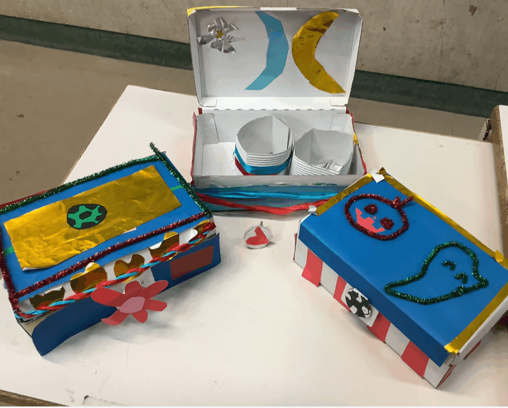 1年生は図画工作の学習で、「たいせつボックス」をつくっています。自分の大切な物を入れるために、色画用紙やキラキラのモールを使って表現します。「楽しい!」「もっとつくりたい!」「みてみてー」と、楽しそうに作る児童の様子が見られました。
