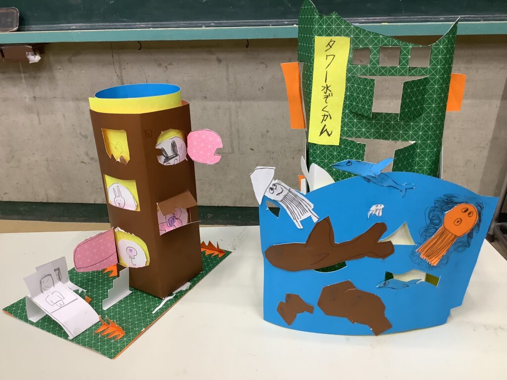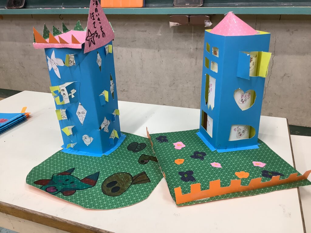 2年生は、図画工作科で「まどからこんにちは」という学習活動をしました。初めてのカッターを使う学習でしたが、一人一人が安全に気を付けて工作をしました。学習を進める中で、はさみとは違った便利さに気付いていました。切り方を工夫し、様々な窓がある作品ができました。