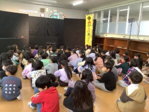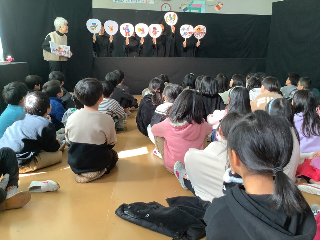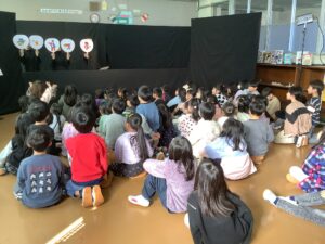 「みかんの木文庫」さんに来ていただき、1年生と2年生に絵本の読み聞かせをしていただきました。絵本の内容に合わせて紙で作った人形が動いたり回転したりしてとってもおもしろかったです。こどもたちも興味津々でした。「みかんの木文庫」のみなさんありがとうございました。