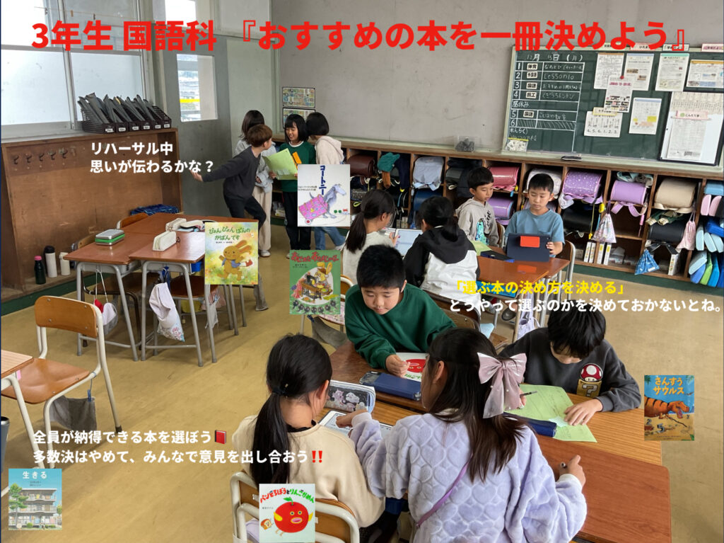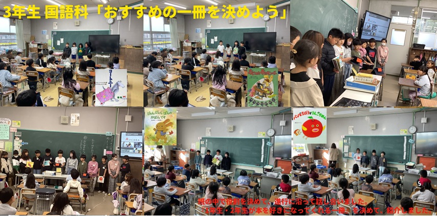 国語科「お気に入りの本を一冊決めよう」の学習を行いました。班の中で役割を決めて、進行に沿って話し合いました。『1年生・2年生が本を好きになってくれる一冊』を決めて、紹介しました。