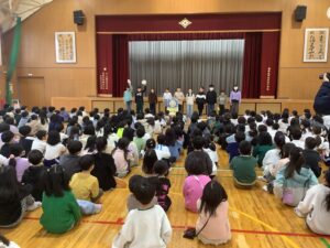 給食委員会からは、大正小学校の給食の残菜量を減らすためのキャンペーンの取り組みの発表がありました。寒い中でしたが、全校でがんばっている「かめり」を意識できていた児童朝礼でした!