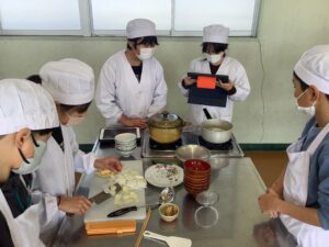 大正ニュース家庭科「食べて元気に」の学習で、ご飯の炊き方やおいしいみそ汁の作り方を学び、実際に調理しました!だしからとったみそ汁とみそだけのみそ汁とを飲み比べし、だしのおいしさに気づくことができました。班の人と協力しながら、楽しくおいしく調理することができました!