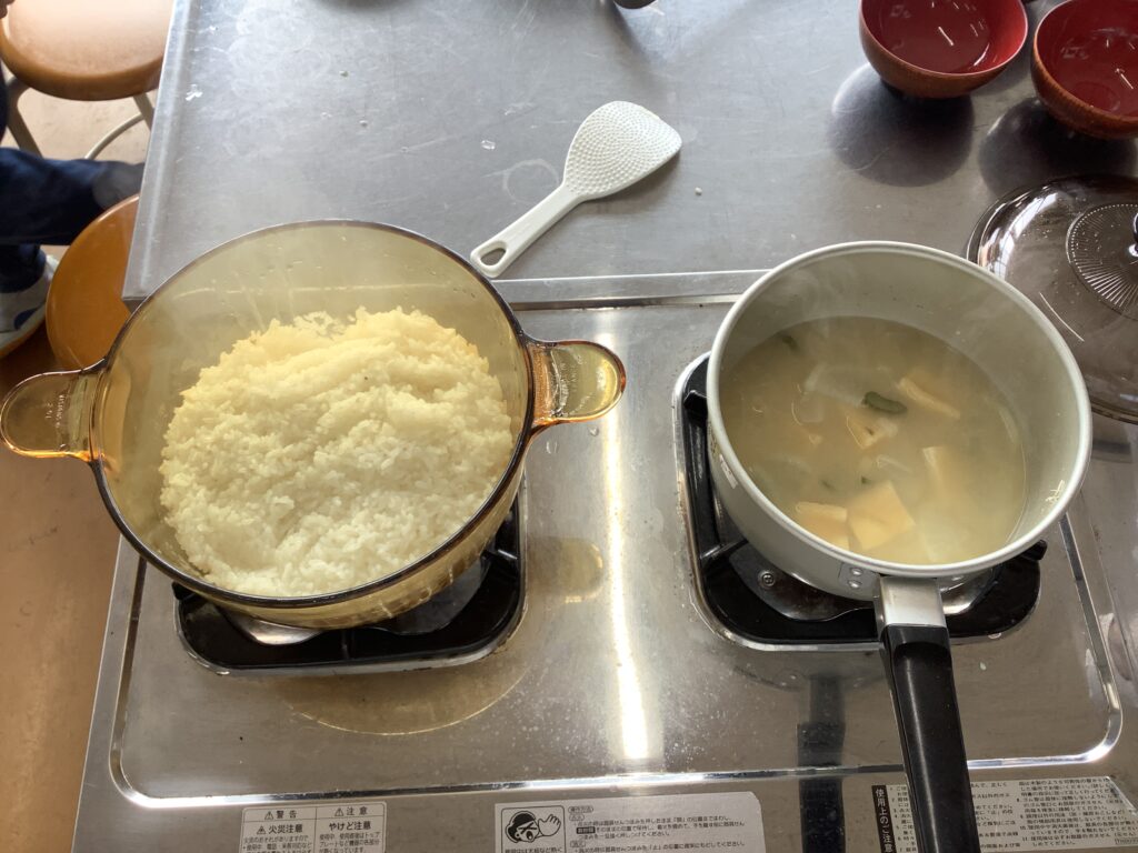 家庭科「食べて元気に」の学習で、ご飯の炊き方やおいしいみそ汁の作り方を学び、実際に調理しました!だしからとったみそ汁とみそだけのみそ汁とを飲み比べし、だしのおいしさに気づくことができました。班の人と協力しながら、楽しくおいしく調理することができました!
