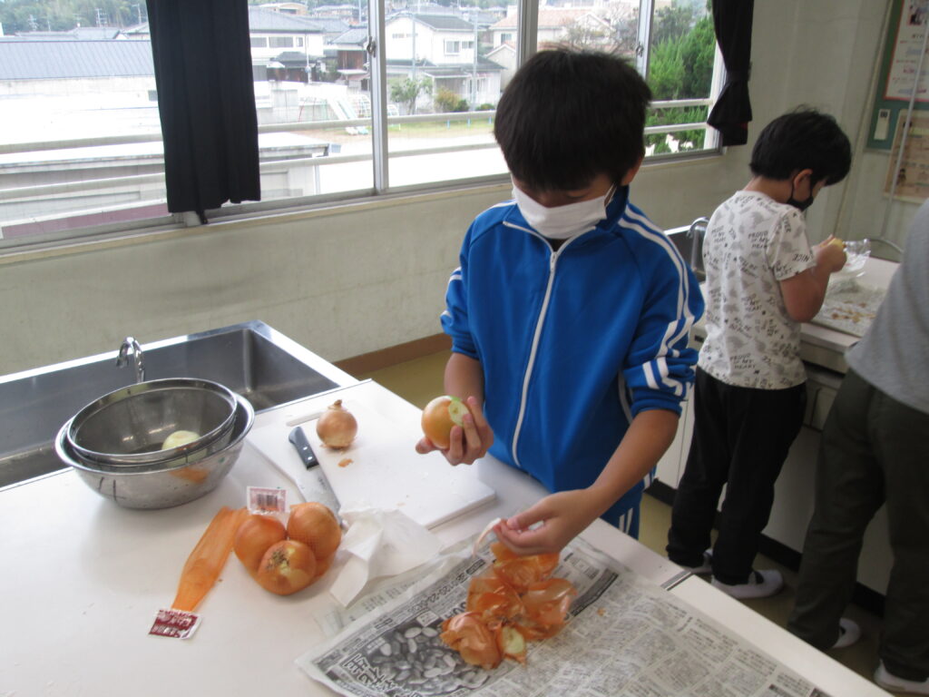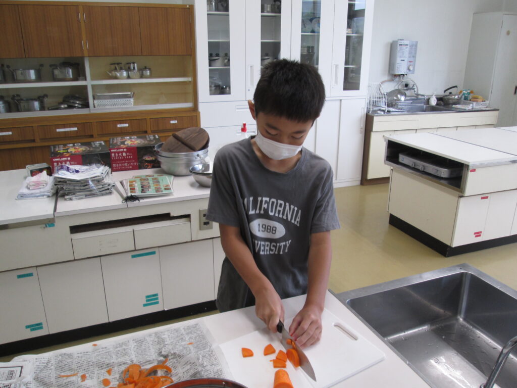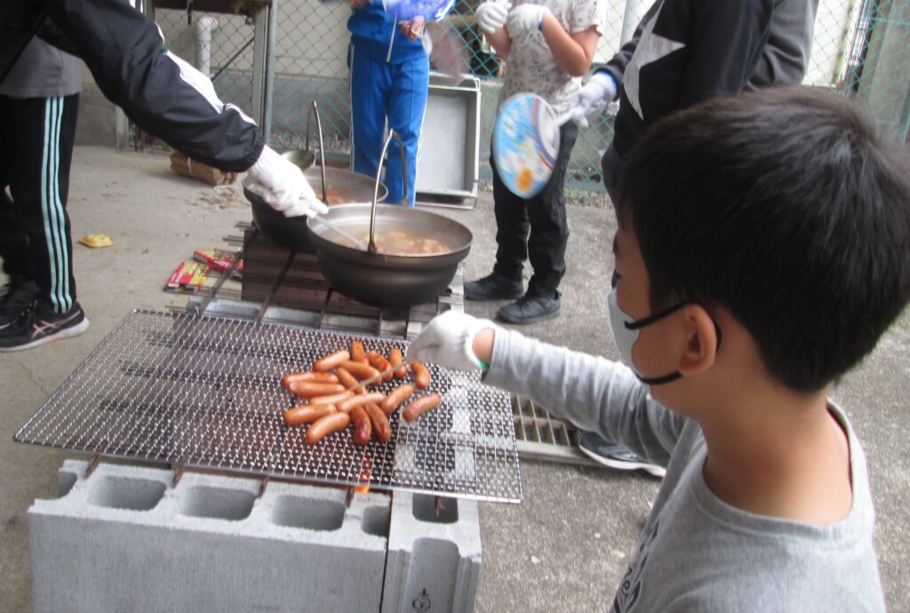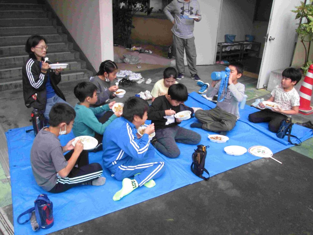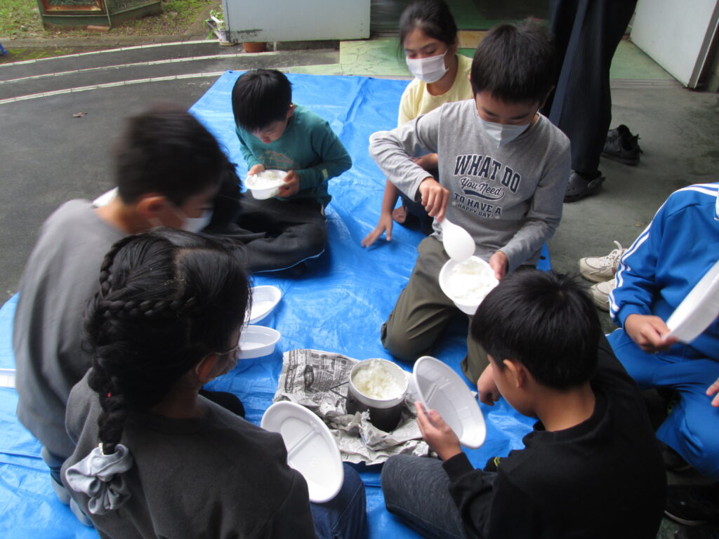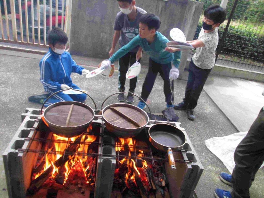 フレッシュバザールへ買い物に行き、自分たちで野菜を切り、かまどで火を焚いてカレーを作り、飯盒でご飯を炊きました。子どもたちは「おいしい。」「食べ放題やな。」と嬉しそうにおかわりをたくさんしていました。