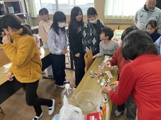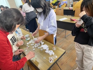 サンタや雪だるま、くまのフィギュアを選び、キラキラのラメを入れて世界に一つだけの作品を作りました。途中、接着剤でつけたフィギュアがなかなか上手く固定できず、苦戦する場面もありましたが、運営委員さんのサポートを受けながら一緒に工夫して完成させることができました。