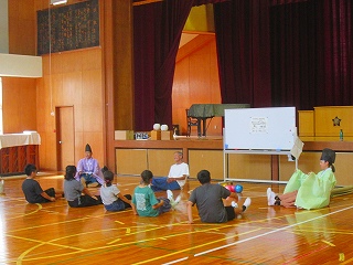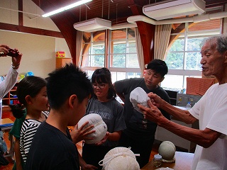 けまり鞠遊会の池田様にお世話になり、けまりの歴史や鞠作りの工程などを教えていただき、実際の鞠を手にしたり、けまりを行ったりしました。