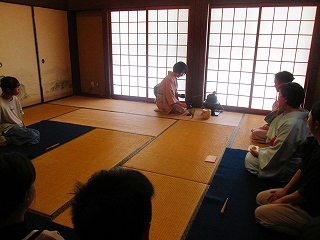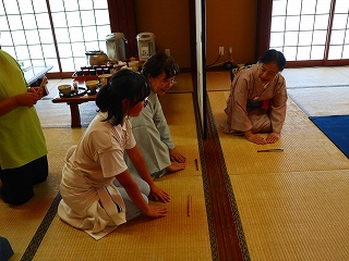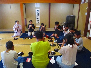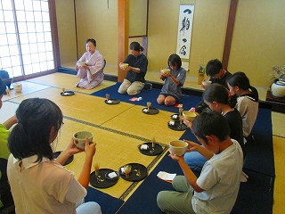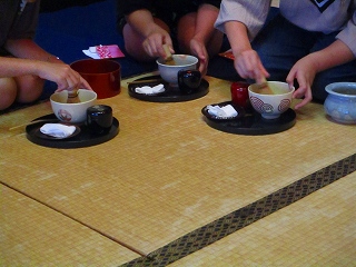 お茶の伝来から茶の湯の作法まで、お話を聞いたり、実際に目の前でお点前を見せていただいたりした後、子どもたちもお点前を体験しました。