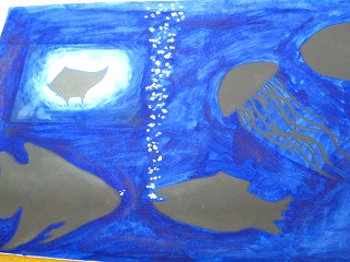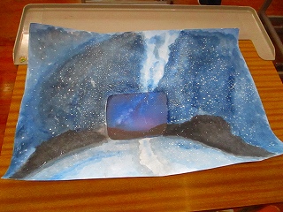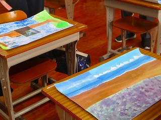 お気に入りの写真を使って、そこから広がる世界を想像して描いた「まだ見ぬ世界」の作品が並んでいました。静かなBGMが流れる教室は、本当のMUSEUMになったかのように感じられ、ゆったりとした気持ちで作品を鑑賞することができました。遙か遠くを見つめるような奥行きや見上げた様子を表現したり、中心から広がる世界が描かれていたり、細かな筆のタッチなども含めて一人一人の思いのこもった「まだ見ぬ世界」がそこにありました。