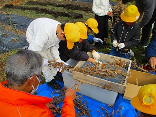 3年生が地域の方にお世話になって畑で育てていた黒豆を収穫しました。