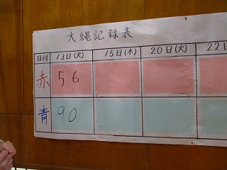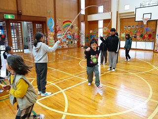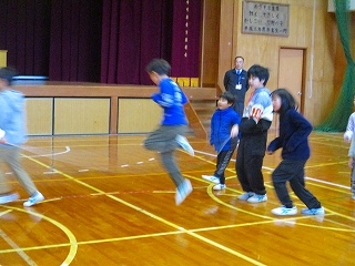 縄に入るタイミングを合図したり、跳んでいる回数を数えたり、赤組も青組も一生懸命でした。縄跳び記録会は1月30日です。当日までにどれくらい記録を更新するのか、楽しみですね。