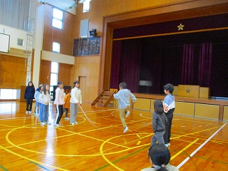 3学期のげんきっ子タイムは、縄跳びです。今日はなかよし班の8の字跳びを行いました。