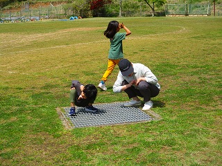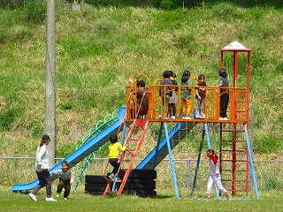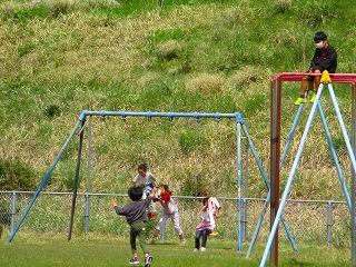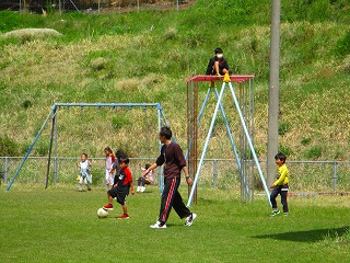 先生と一緒にサッカーを楽しむ子どもたち、芽生川をのぞき込む姿もありました。遊具を使って友達や先生と遊んだり、おにごっこが始まり逃げたり、追いかけたり・・・優しくおに役を交代する姿も見られ、微笑ましい気持ちになりました。