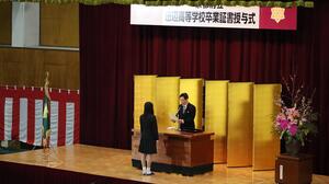 式では卒業生一人一人の名前が呼ばれ、卒業生たちはそれぞれ力強く返事をして起立しました。その後、各クラスの代表生徒に卒業証書が授与されました。