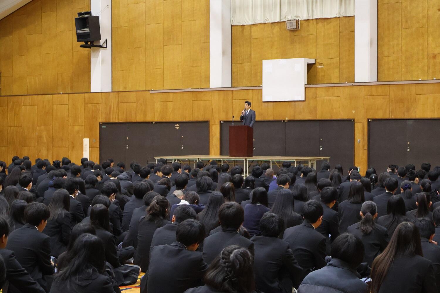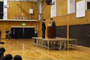 式では校長から、この1年間を振り返るとともに、生徒の皆さんがそれぞれの場面で努力を重ね、成長してきたことへのねぎらいの言葉がありました。また、これから迎える進級に向けて、新たな目標を持ち、自覚と責任をもって学校生活を送ってほしいとの話がありました。