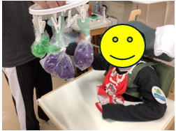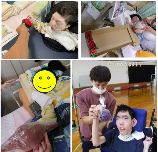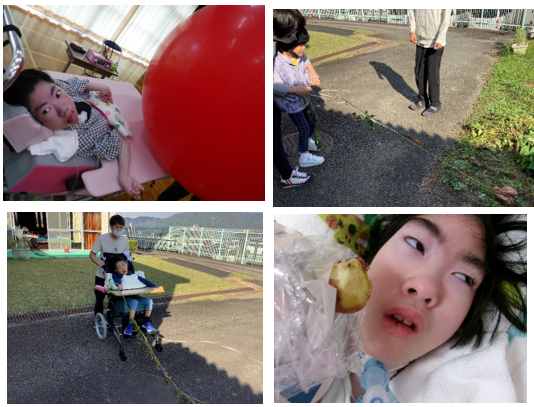 10月は行楽シーズンということもあり、「秋のハーベストフェスティバル」と称して、ぶどう狩りや芋掘り等の収穫に取り組みました。収穫するぶどうは工作した物等を使いましたが、学校で採れた冷凍ぶどうを触ったり、ぶどうジュースの匂いを感じたりしました。学校での芋掘りは、友達と一緒に蔓を引っ張って収穫しました。病棟内では、作った蔓に本物の芋を付けて引っ張り、最後には焼き芋の香りを楽しみました。子ども達の学習に取り組む様子を御覧ください。