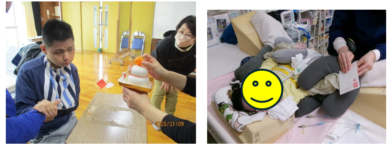 未分類 「お正月」って何するの?? 未分類 2026.02.10 生活単元学習「お正月」での子ども達の姿です。「お正月と言えば何かな?」という先生のお話を聞いた後、年賀状作りや書初め、福笑いに挑戦しました。 年賀状作りでは素敵な年賀状がたくさん完成しました。友達との年賀状交換も楽しいね。 最後に福笑いに挑戦しました。「目はどこかな?」「鼻はどこかな?」自分の顔で確認しながら貼っています。最後はどんな顔になるのでしょうか?最後にみんなで完成した福笑いを見せ合うのも楽しい時間です。 Post Views: 60