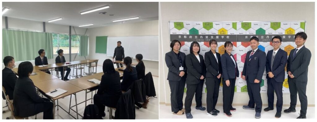 全校教職員 他校種体験研修 2025.11.19 11月18日(火)、京都府の他校種体験研修の一環として、園部高等学校、亀岡高等学校、農芸高等学校の計7名の先生が本校で体験をされました。半日という短い時間でしたが、学校の概要や特別支援教育の講義を受けた後、実際に児童生徒の指導にも入り、とても有意義な時間となりました。ここで学んだことを今後の教職人生に生かしてください。 Post Views: 8