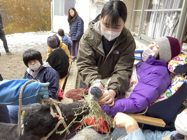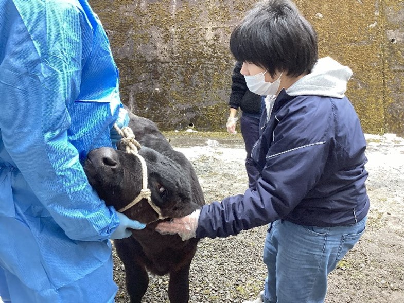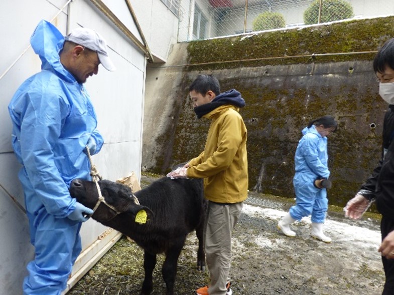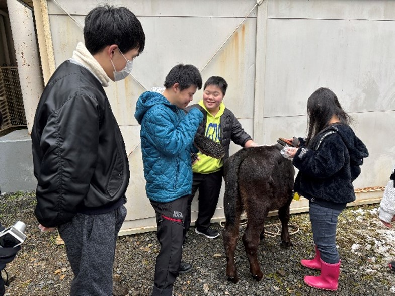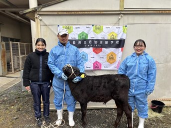 1月26日(月)に動物とのふれあい学習の一環で、京都府農林水産センター畜産センターから獣医師さんや技師さんと一緒に生後2か月の仔牛がやってきました。事前の学習では、牛の餌や牛乳のでき方など牛の生活について学び、身近な動物であることを知りました。当日のふれあい体験では、頭や体を撫でたり、ブラッシングをしたり、餌をあげたり、聴診したり、散歩をしたりとたくさんの貴重な体験ができました。生徒たちからは、「あったかい」「ふわふわする」「においがする」「モーって鳴いた」「ドクドクしてる」等の口々に感想が飛び交い、五感を使って「生きている温かさ」に触れることができました。京都府農林水産センター畜産センターの皆様、貴重な体験をありがとうございました。