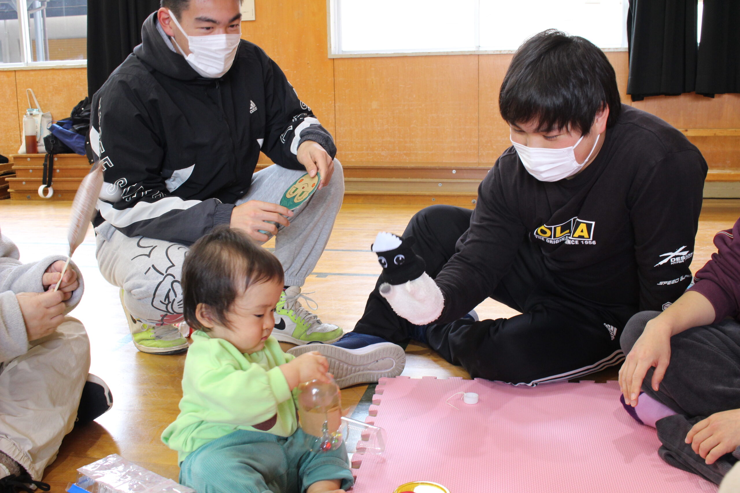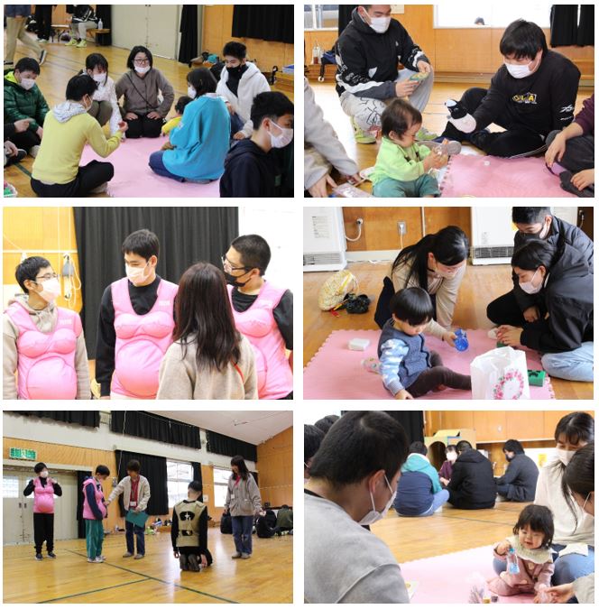 生徒は手作りおもちゃで遊んだり、お母さんへ質問したりする中で、赤ちゃんの成長や子育てについて学びました。