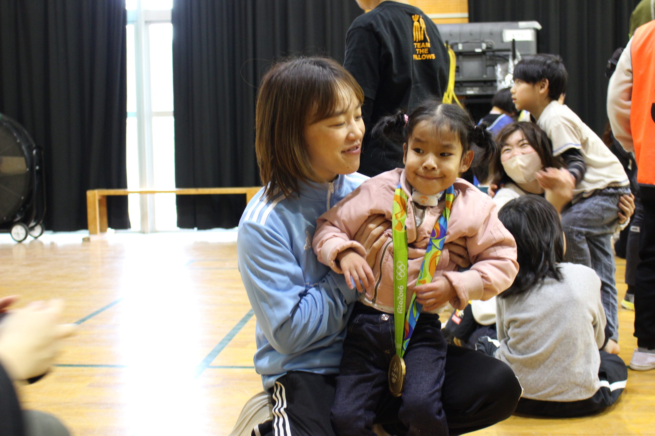 ピックレスリングやPKゲームなどのスポーツを通して、本物の技や温かいお人柄に触れることができ、貴重な時間を過ごしました。「オリンピックの金メダル!」「かっこよかった!」「楽しかった!」と、児童たちのにこにこ笑顔があふれました。